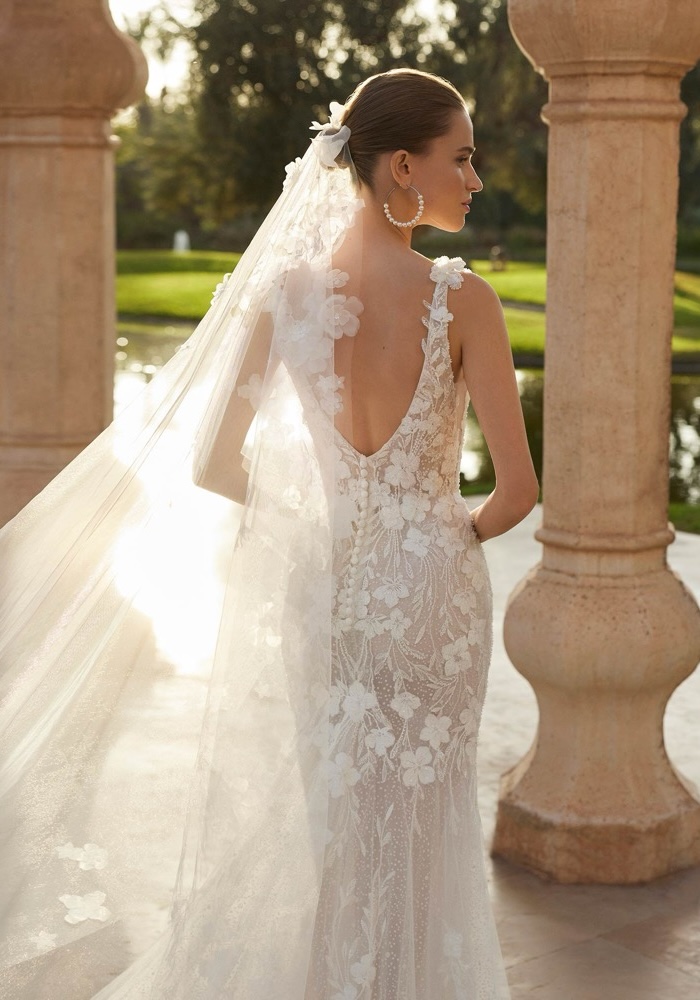 Long wedding veil in tulle adorned with intricate 3D flowers.