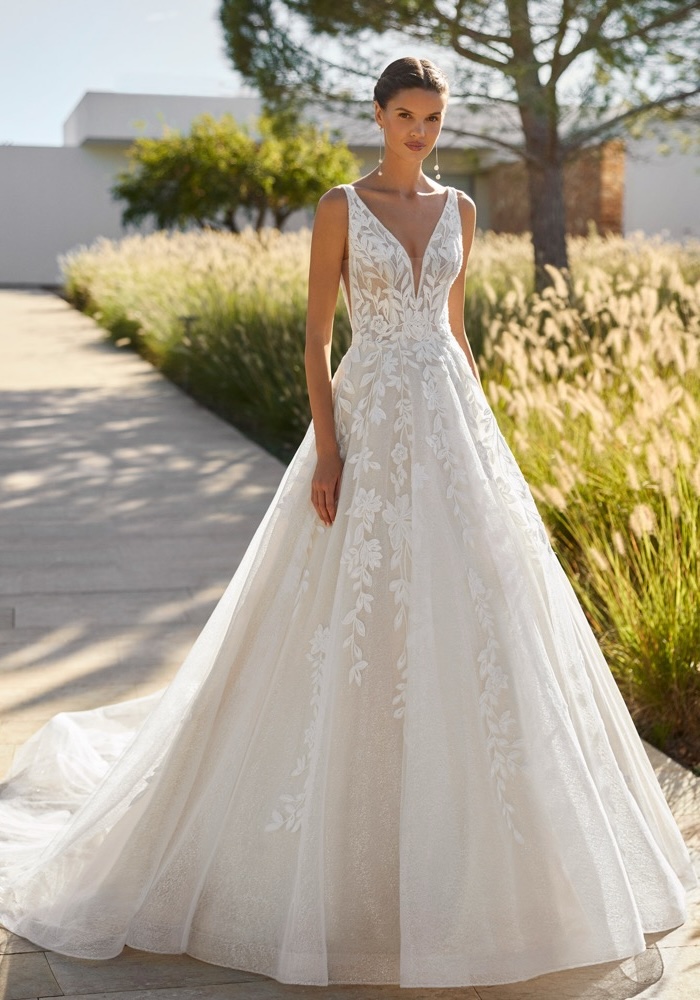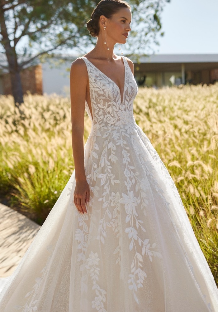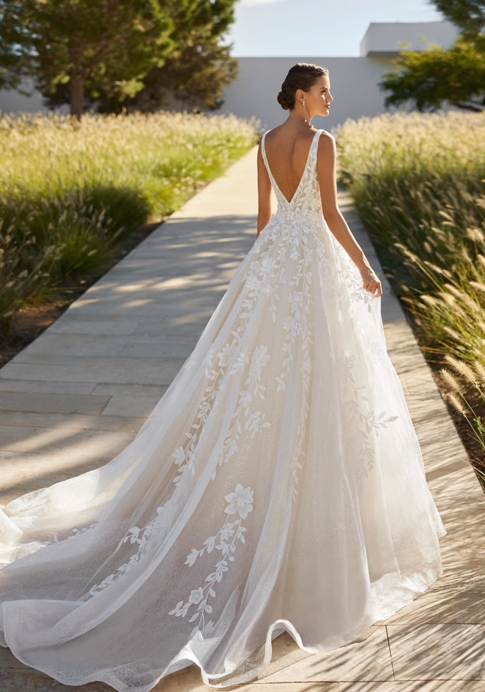 V-neck princess wedding dress crafted from embroidered tulle, adorned with delicate floral lace placements all over with a low back.