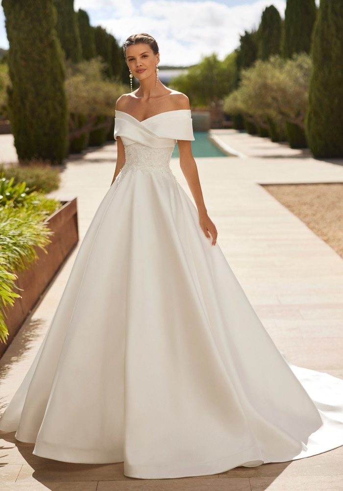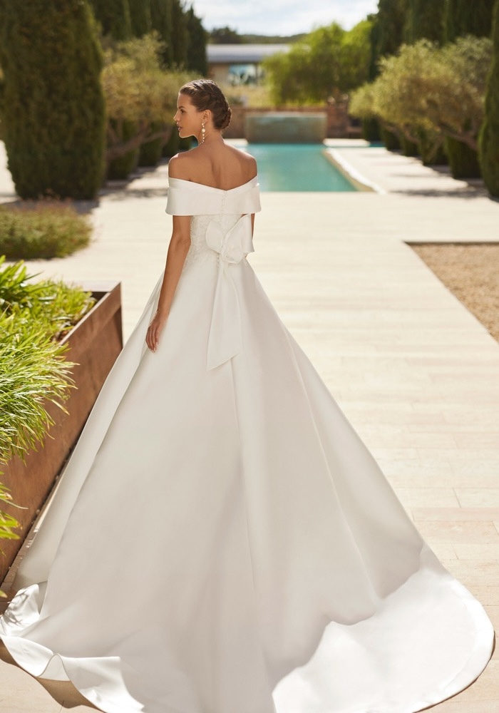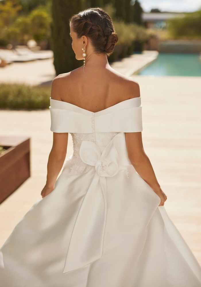 Off-shoulder A-line wedding dress crafted from mikado with a pleated neckline, featuring beaded lace detail at the waist with a statement back bow.