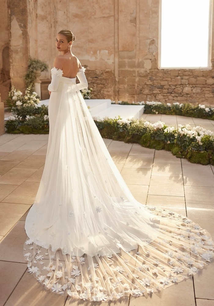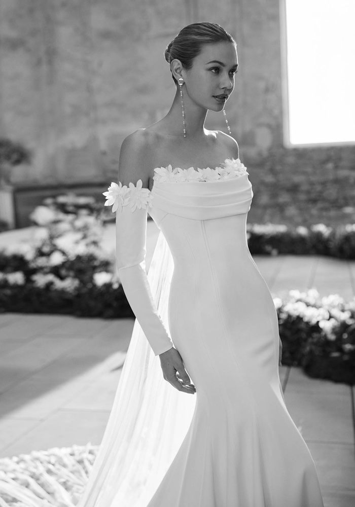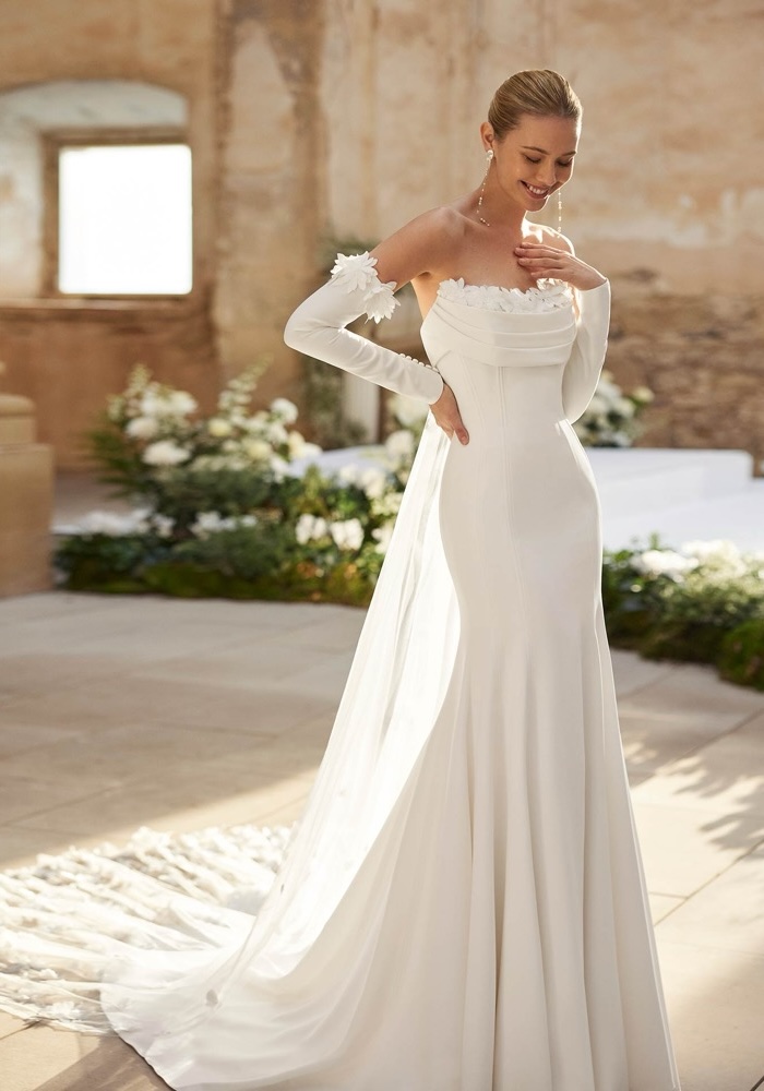 Crafted from stretch crepe, this strapless mermaid wedding dress boasts a beautifully draped neckline adorned with delicate flowers. The design culminates in a breathtaking illusion train, scattered with matching blooms. Complete your look with the optional detachable sleeves for a customizable bridal ensemble.