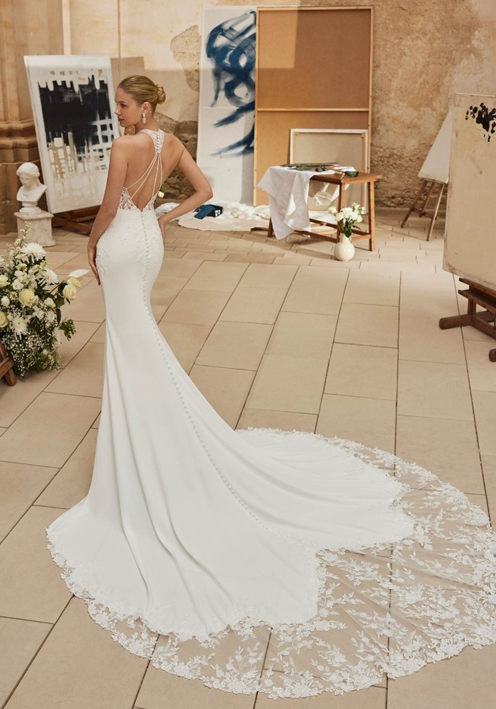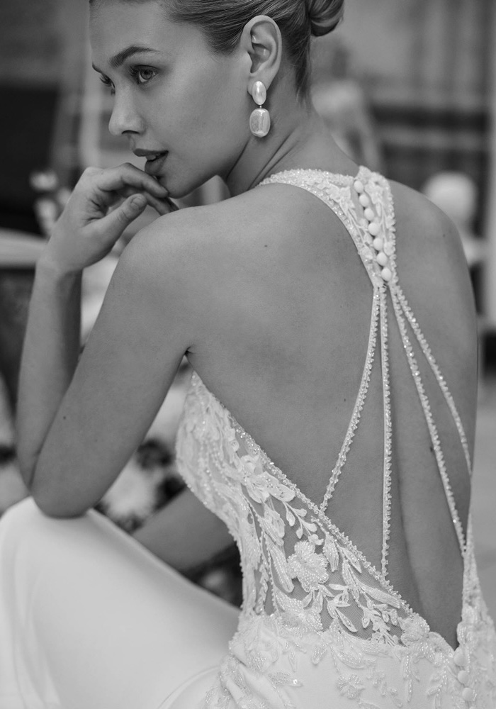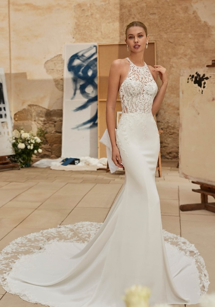 Halter neckline mermaid wedding dress made of stretch crepe adorned with intricate beadwork and lace on the bodice, featuring a breathtaking illusion train.