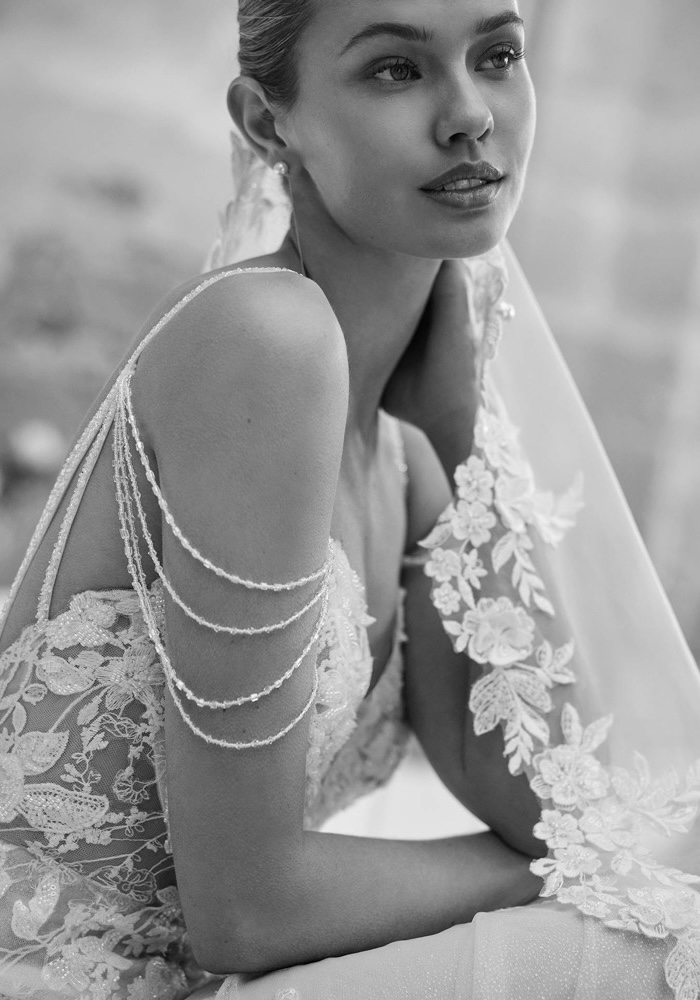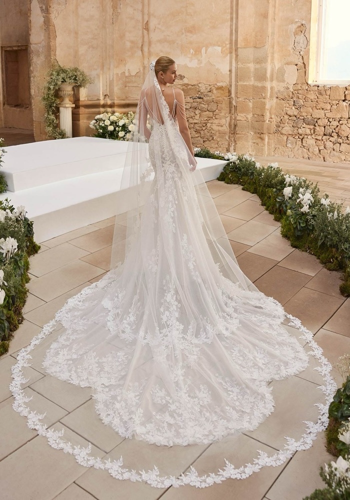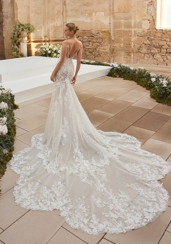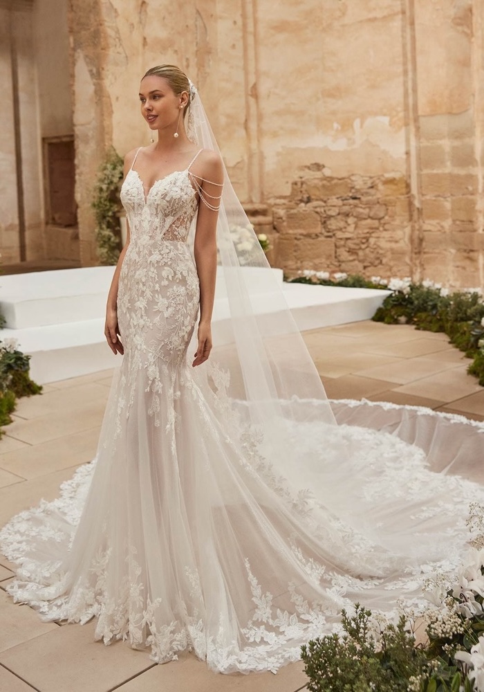 Sweetheart neckline mermaid wedding dress adorned with intricate beaded floral lace motifs throughout the entire gown with beaded straps and a breathtaking long train.