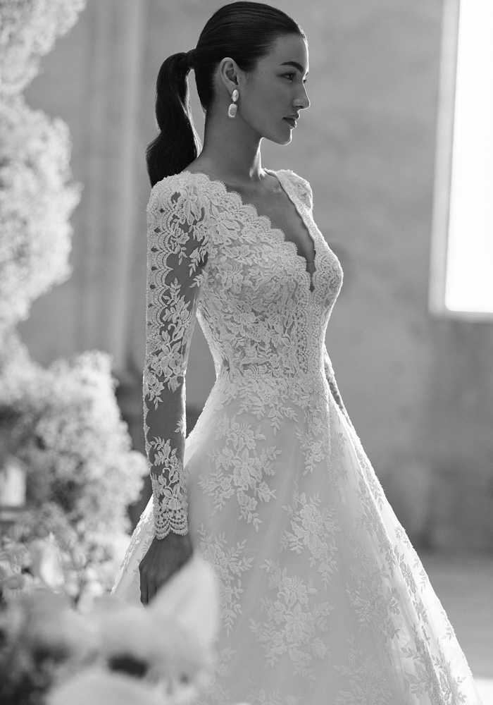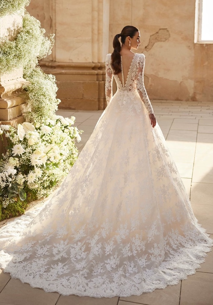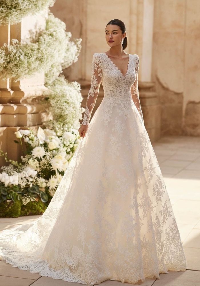 V-neck princess wedding dress crafted in delicate lace and adorned with intricate beadwork, featuring elegant illusion sleeves and a captivating back.