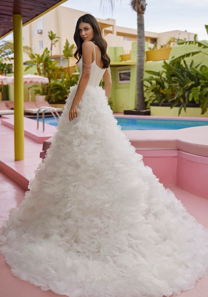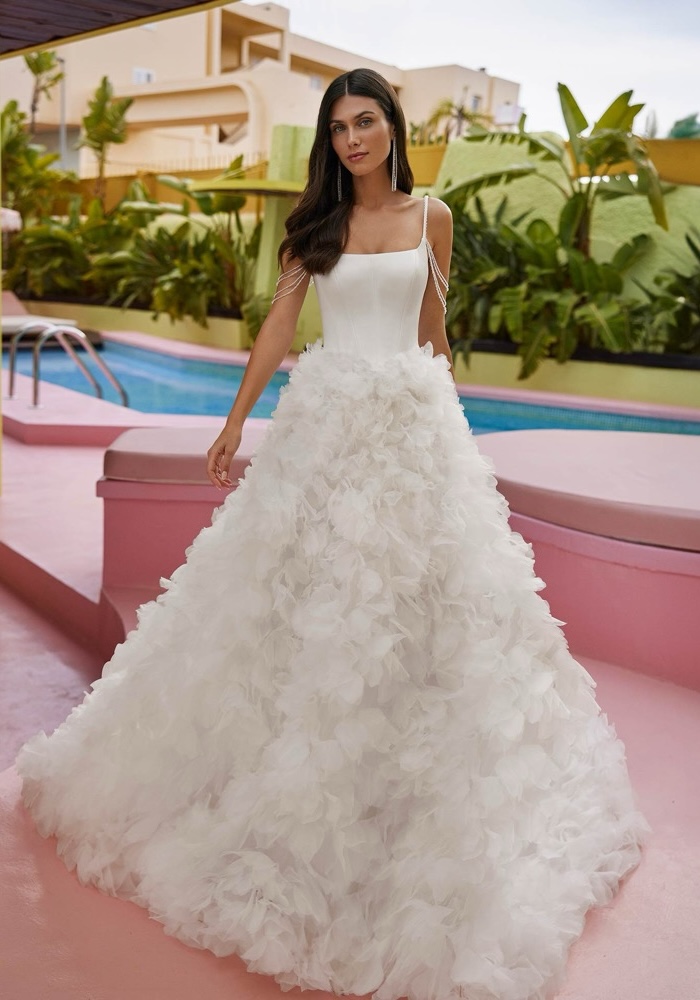 Square neck princess wedding dress with a tailored satin bodice and beaded straps, featuring a dreamy ruffle skirt made of 3D flowers.