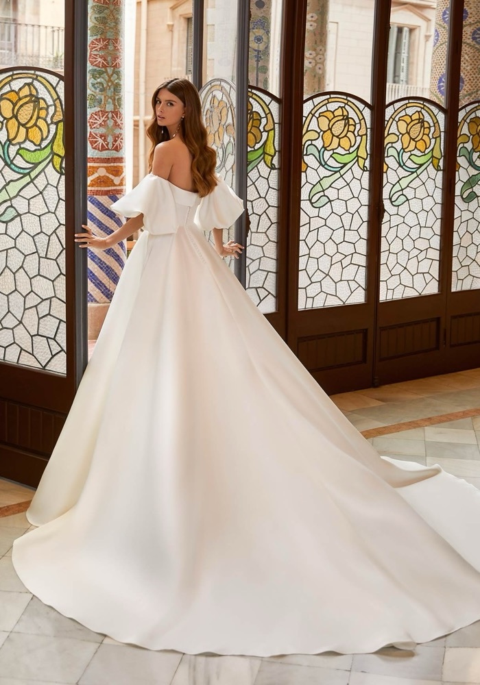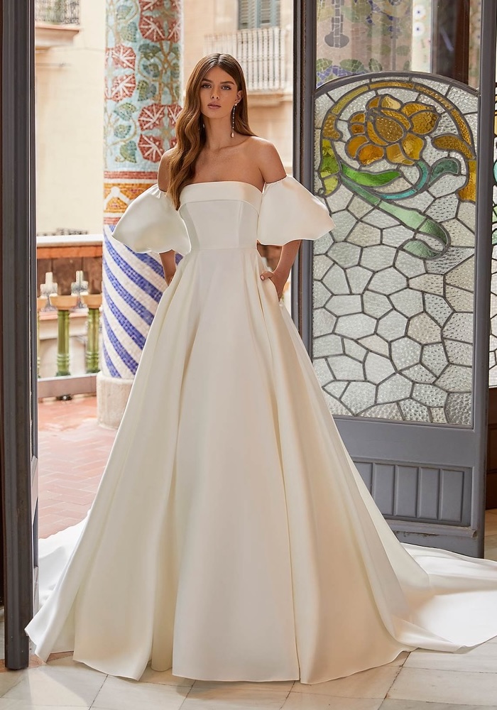 Strapless neckline A-line wedding dress crafted from matt mikado with a tailored bodice, featuring practical side pockets on the skirt. Can be complemented with a detachable puffed sleeves.
