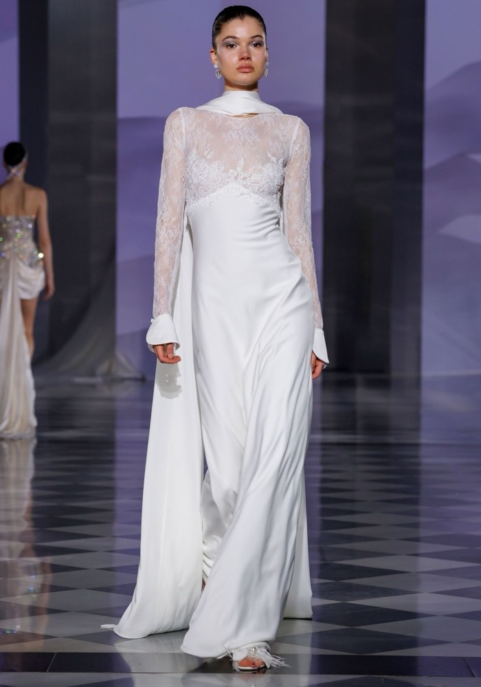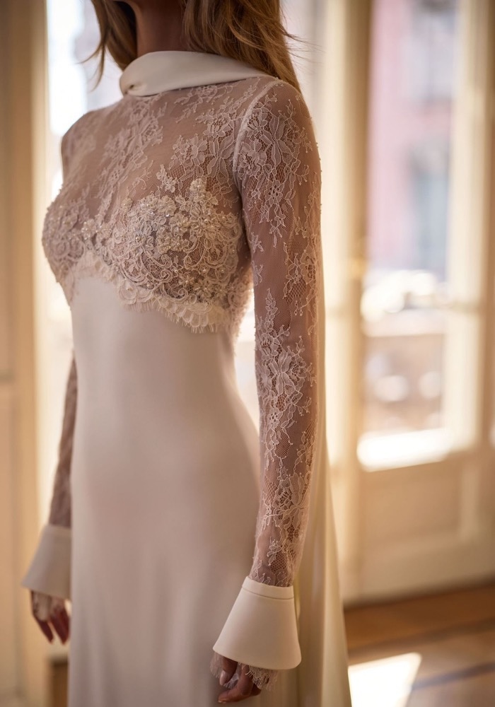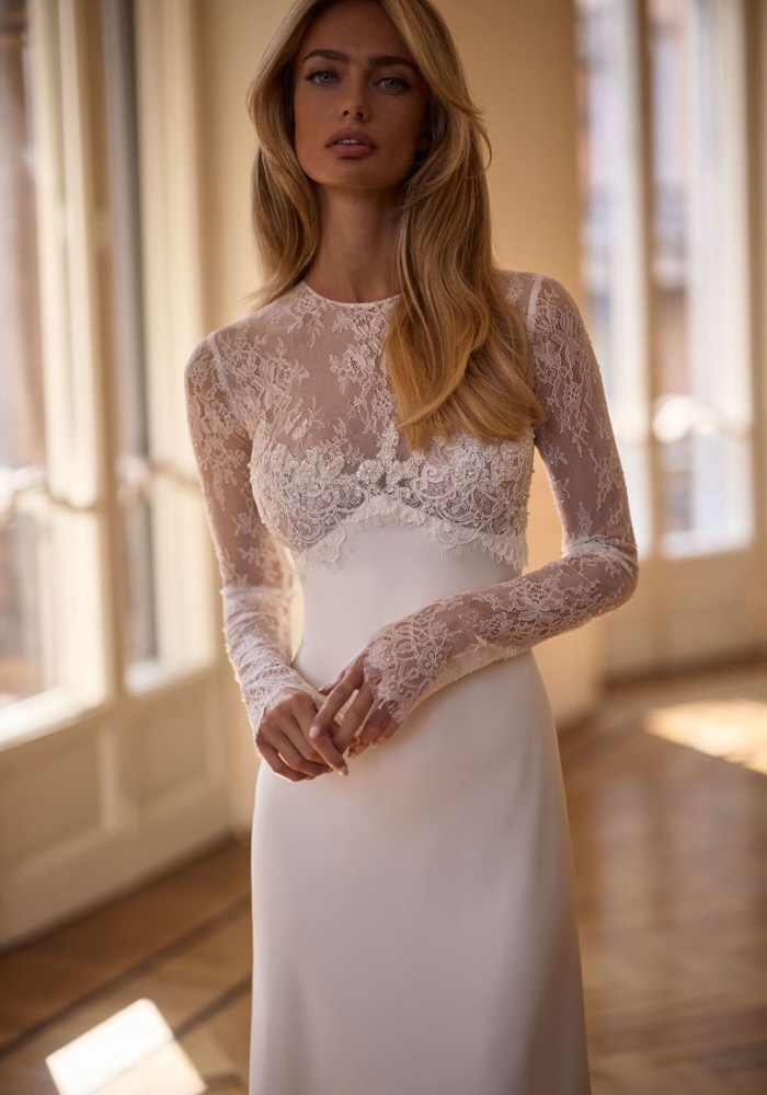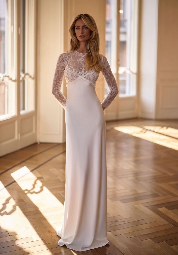 Crew neck column wedding dress in soft satin, featuring a semi-sheer lace bodice and long sleeves with detachable cuffs.