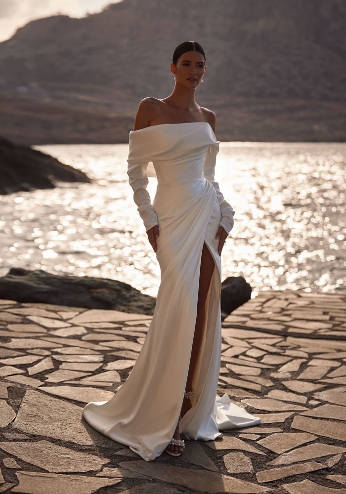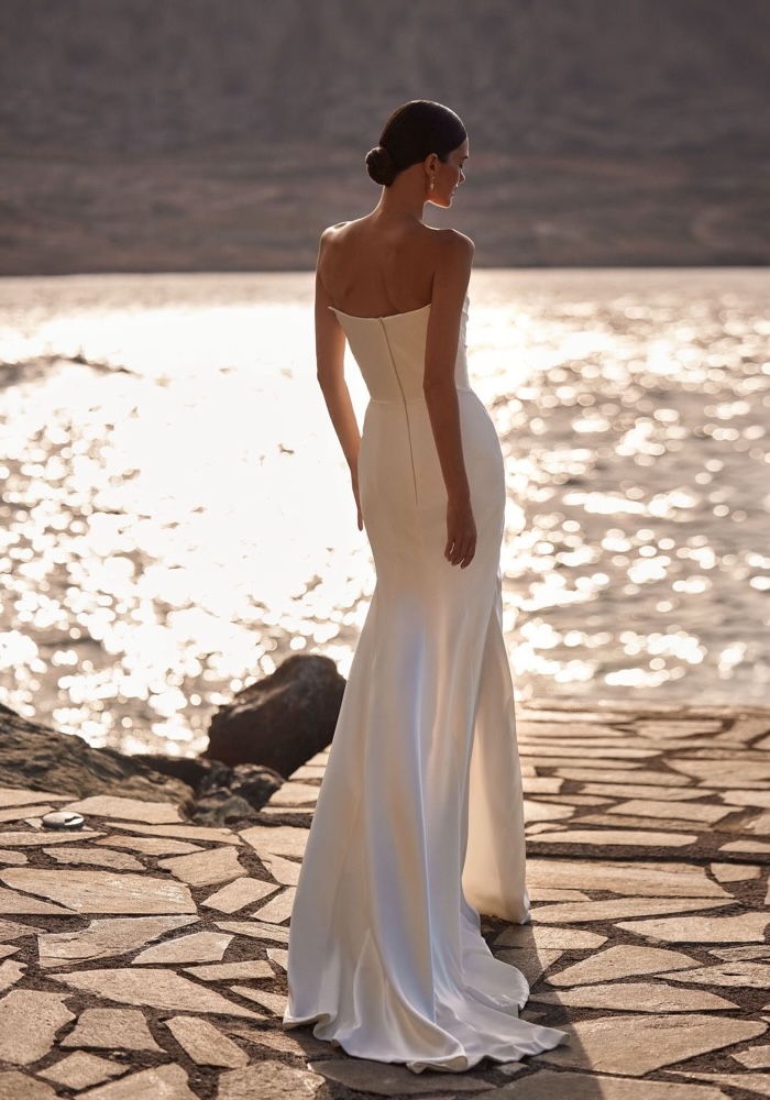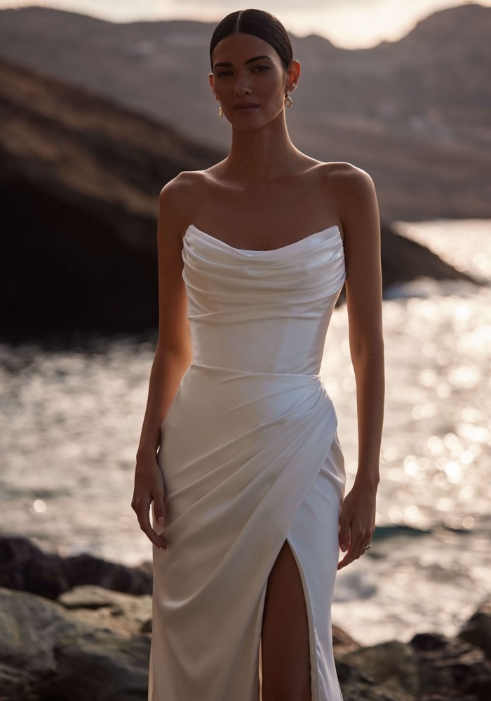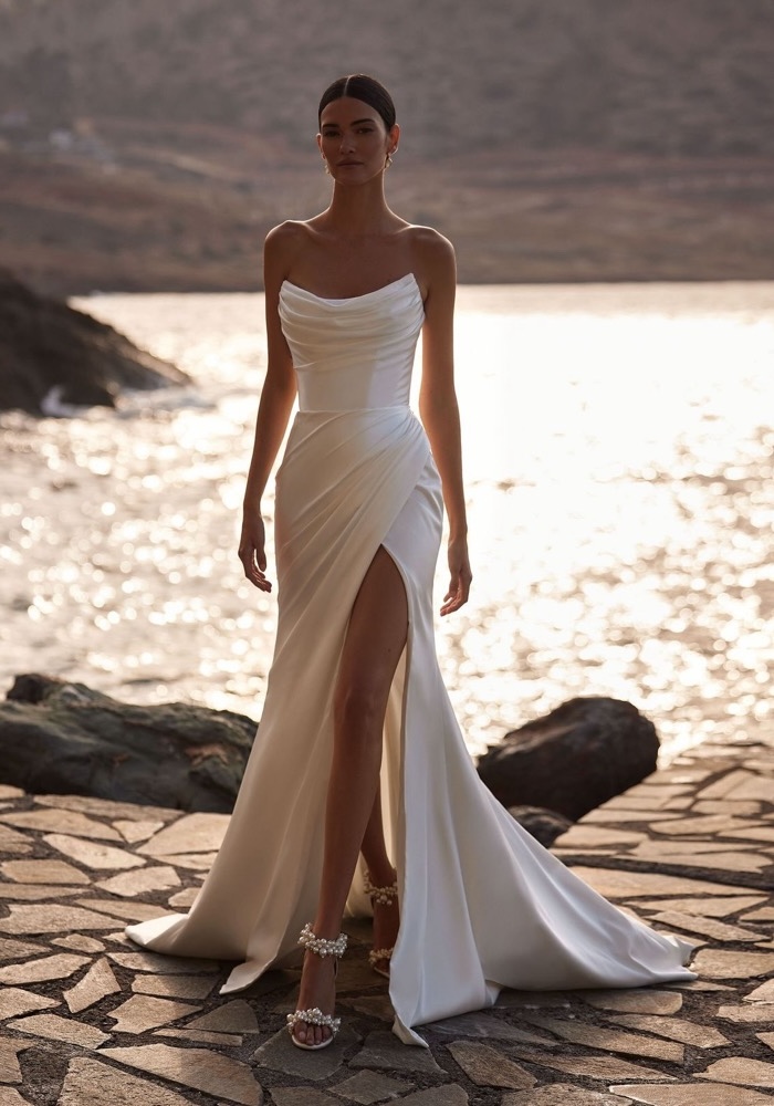 Strapless neckline mermaid wedding dress crafted from satin with a beautifully draped neckline and skirt, featuring a daring thigh-high slit. Can be paired with a chic off-shoulder bolero.