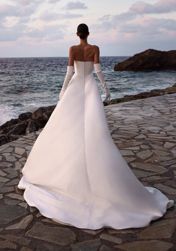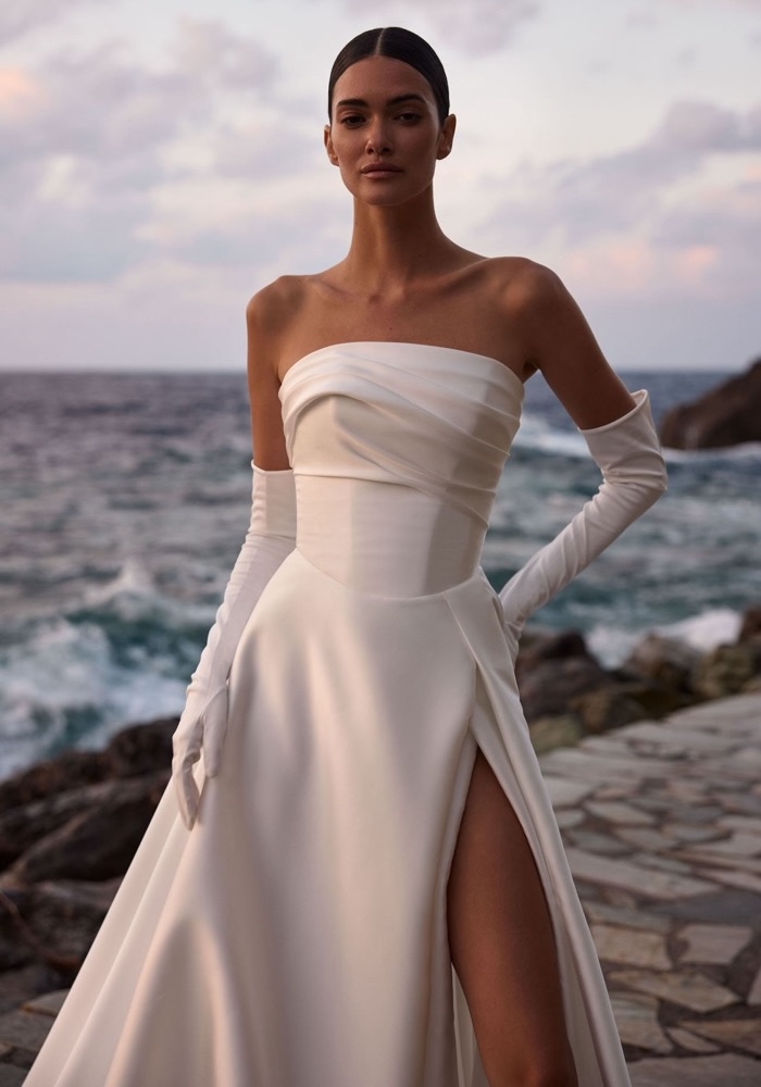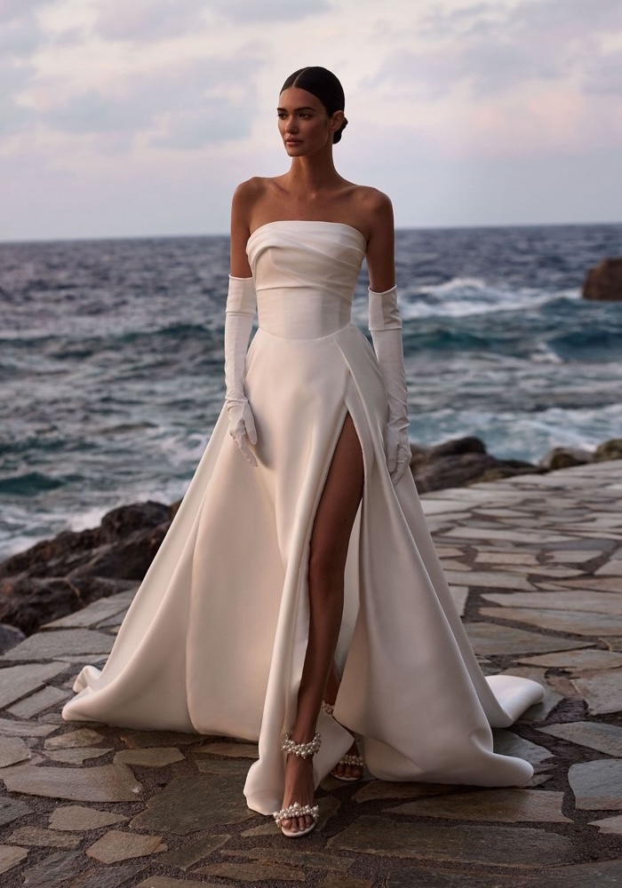 Strapless A-line wedding dress crafted from soft mikado and features a sculpting corset bodice with a draped detail. The A-line skirt includes a thigh-high slit and a long train.