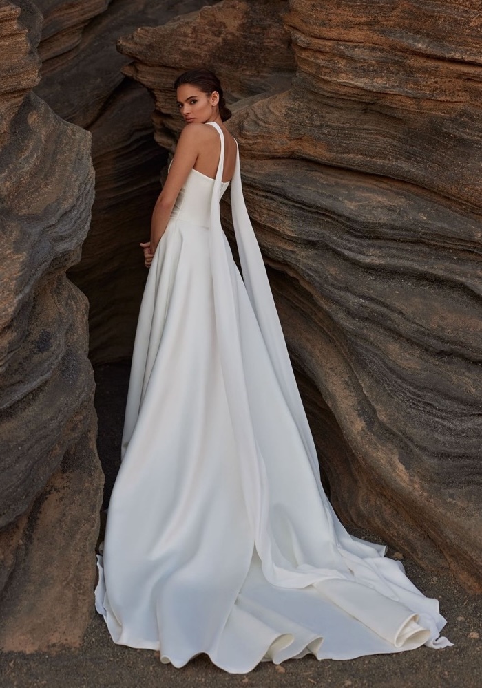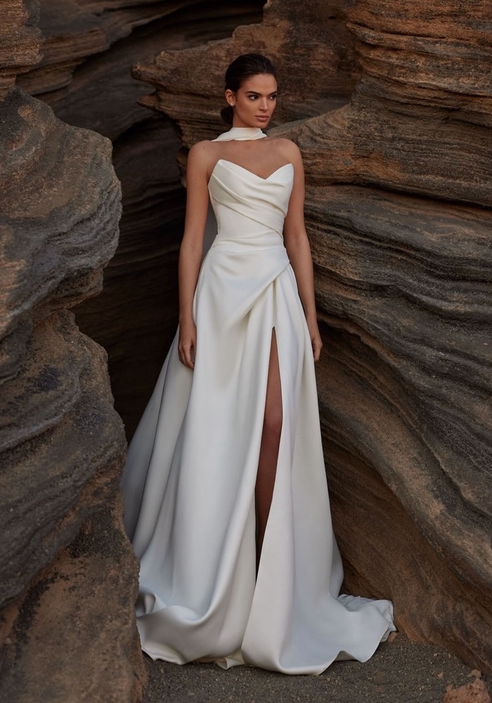 Strapless neckline A-line wedding dress crafted from satin, featuring a beautifully draped bodice with a thigh-high slit.