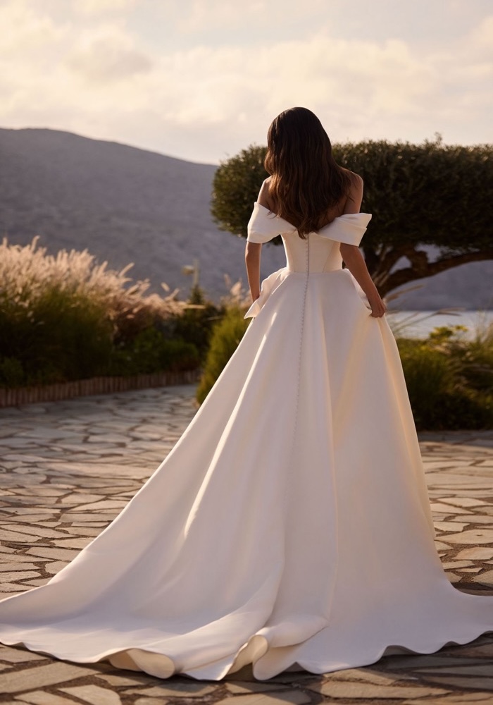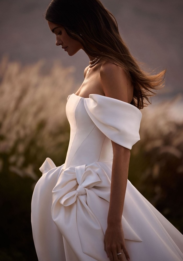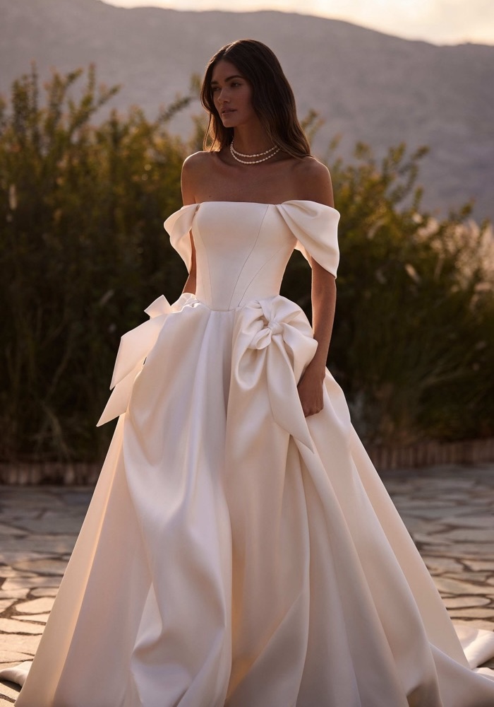 Off-shoulder princess wedding dress crafted from mikado with striking 3D bows on the waist, featuring detachable off-shoulder sleeves.