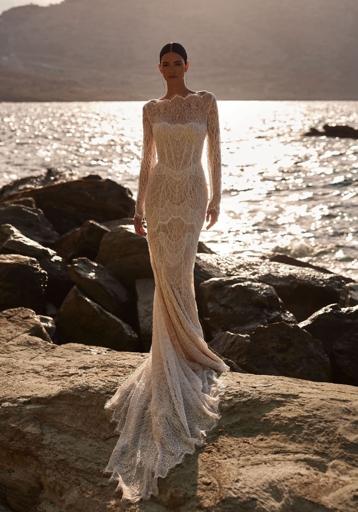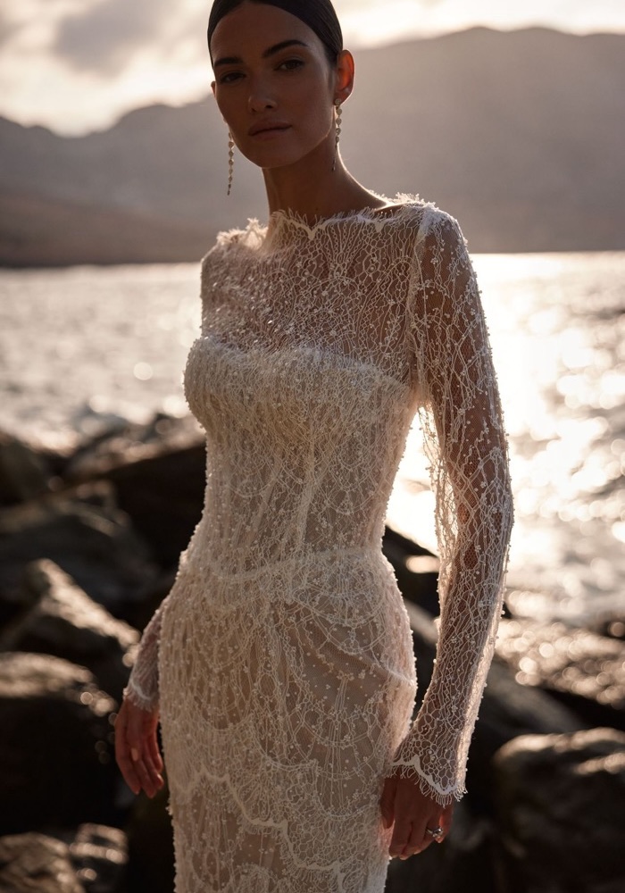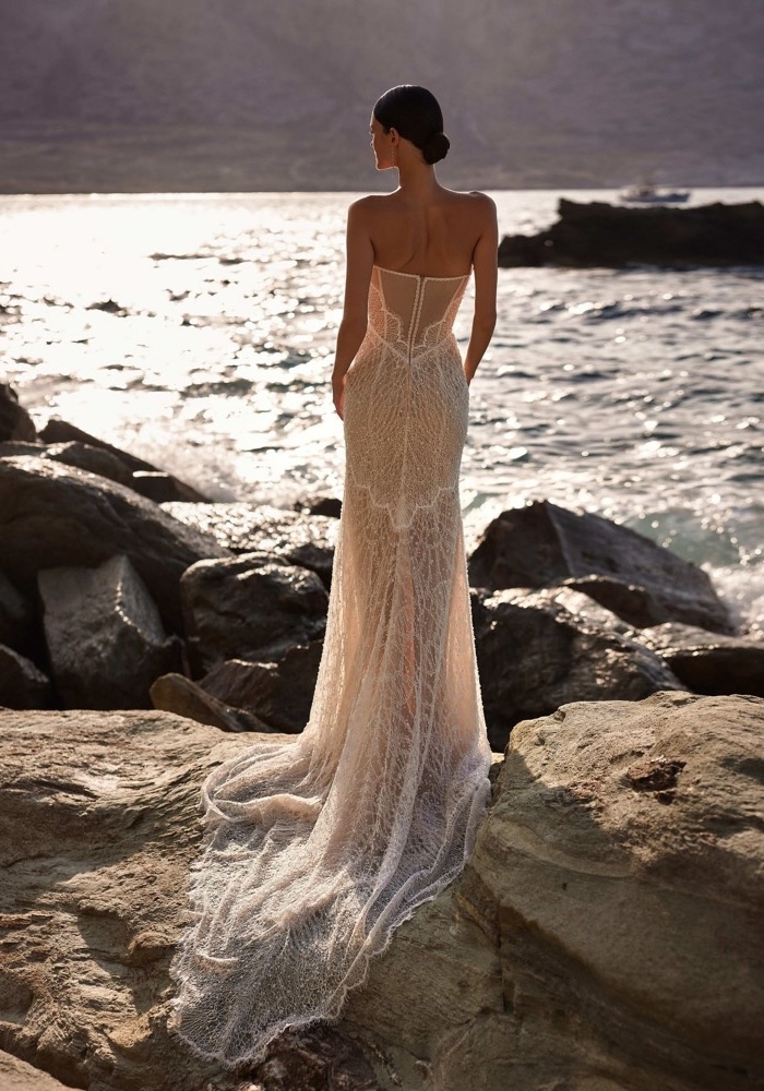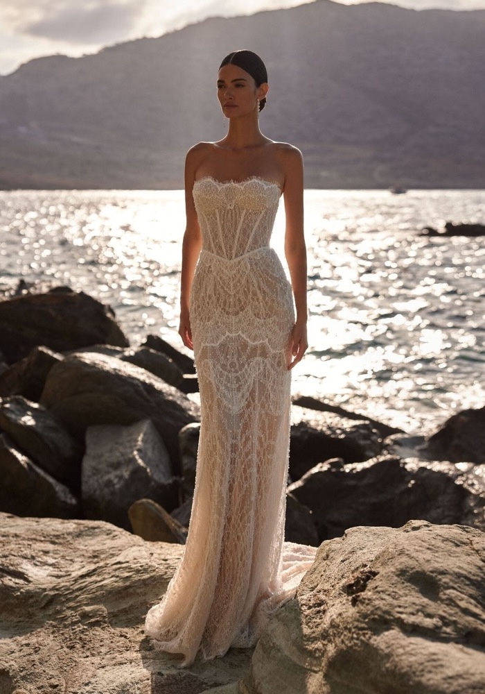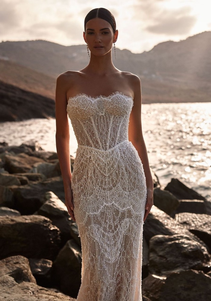 Strapless neckline mermaid wedding dress with a semi-sheer corset bodice, featuring cascades of intricately patterned lace with shimmering beads. This gown can be elevated with a long sleeve bolero with matching beaded lace detail.
