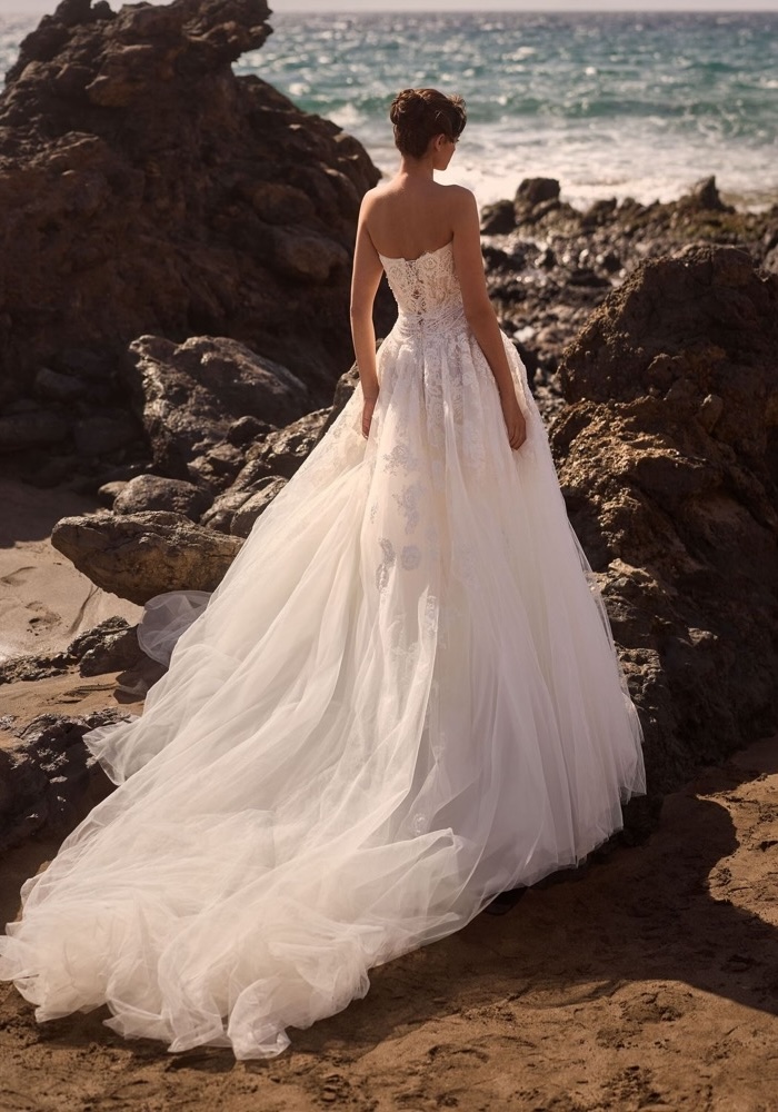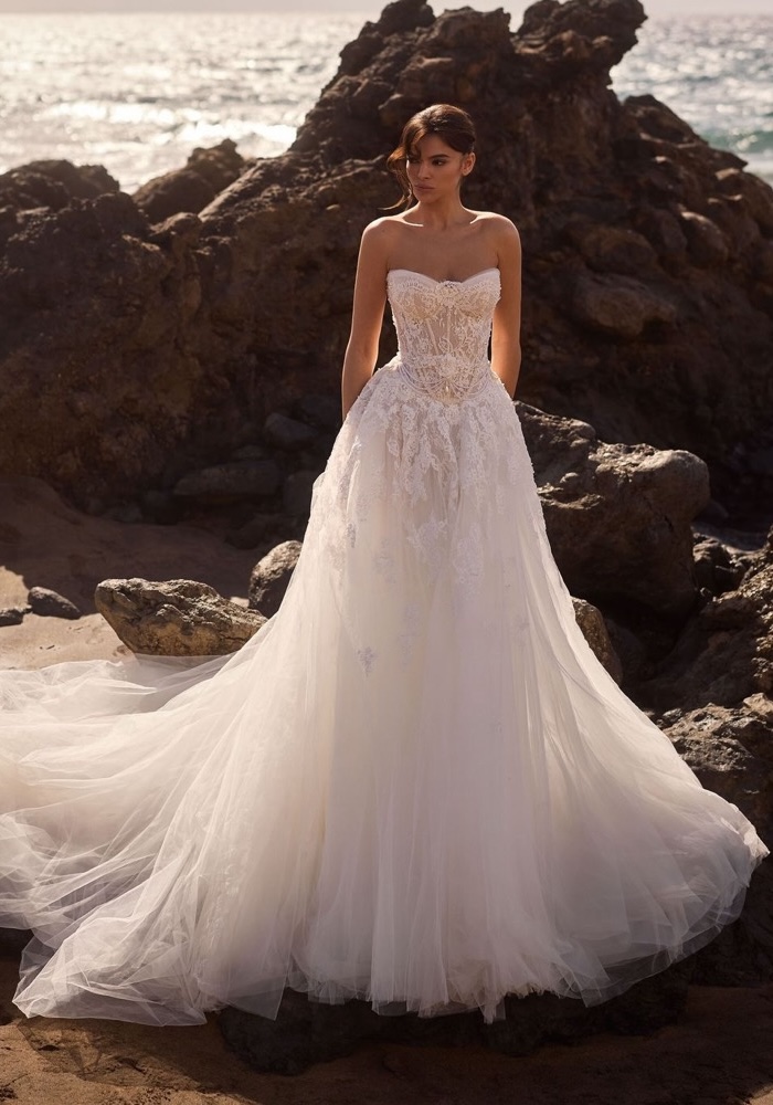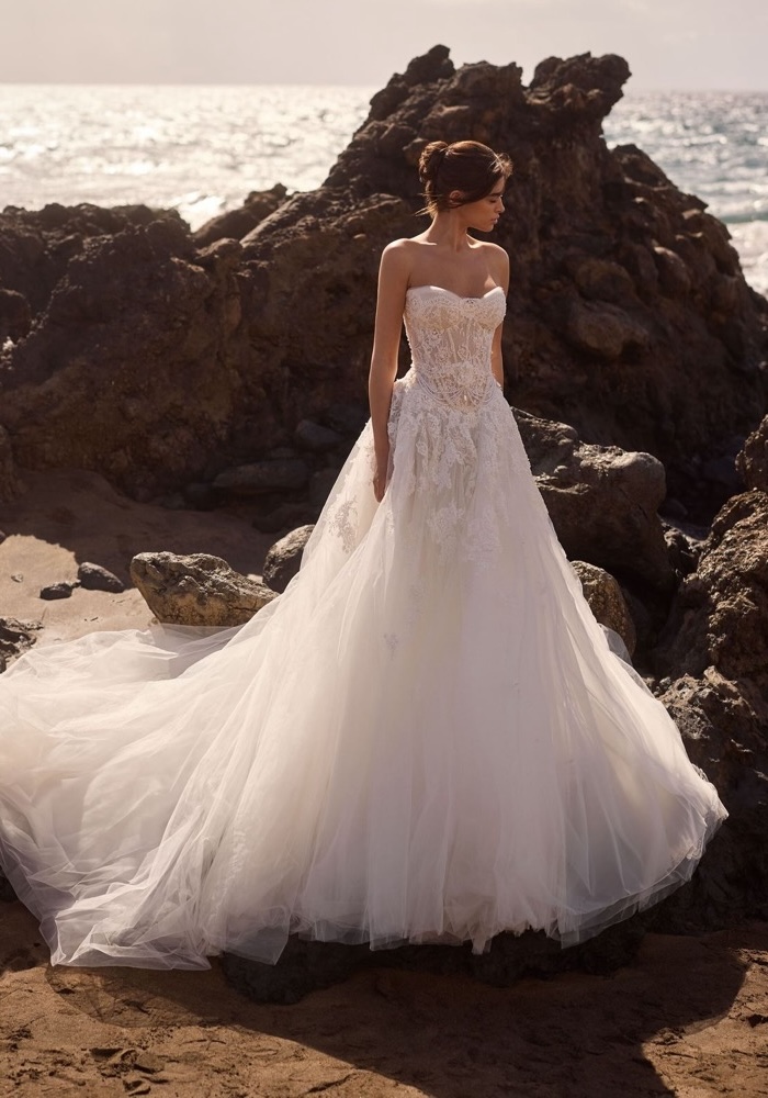 Strapless neckline A-line wedding dress with a sculpted, corset bodice adorned with cascades of intricate beaded floral lace appliques, featuring a dreamy long train.