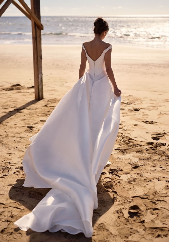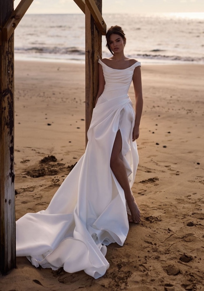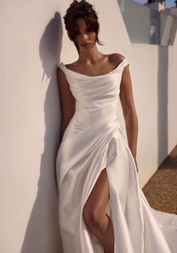 Off-shoulder A-line wedding dress crafted from satin with a corset bodice and subtle draping, featuring a side slit and a sweeping long train.