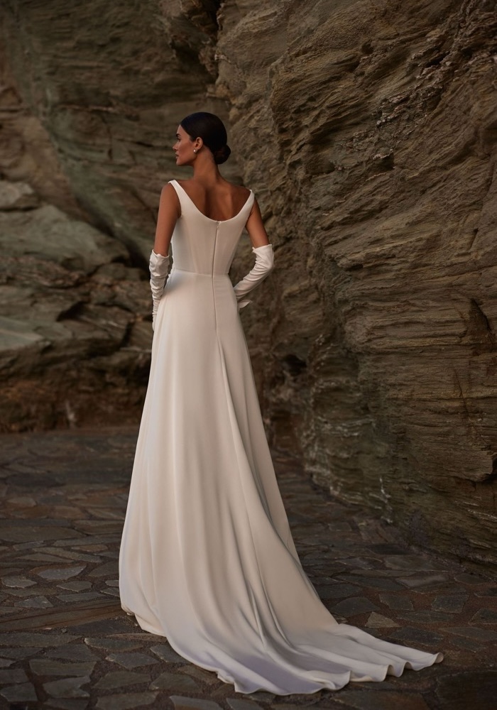 Scoop neck A-line wedding dress crafted from satin with a corset bodice, featuring a beautifully draped bodice.
