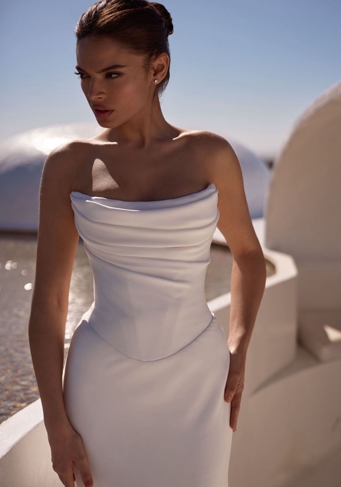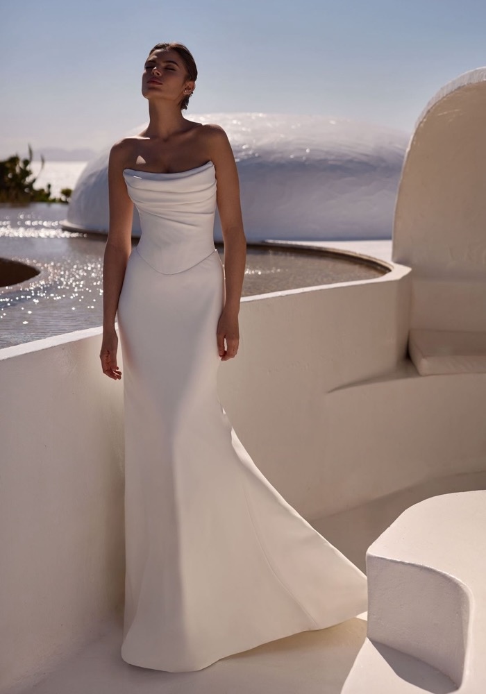 Strapless mermaid wedding dress crafted from stretch satin with a boned corset bodice and draped neckline. The back features a row of decorative buttons with a short train.