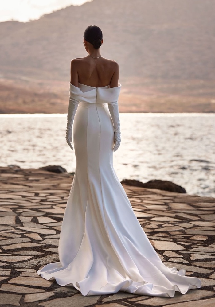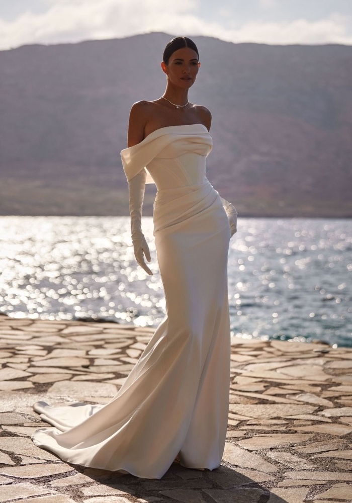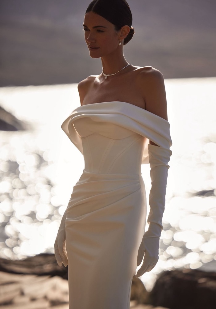 Off-shoulder mermaid wedding dress crafted from soft satin with a structured, boned bodice, featuring beautifully draped skirt. Paired with long sleeved gloves.