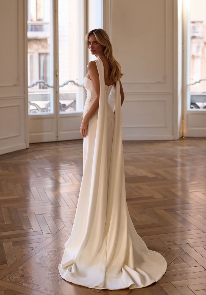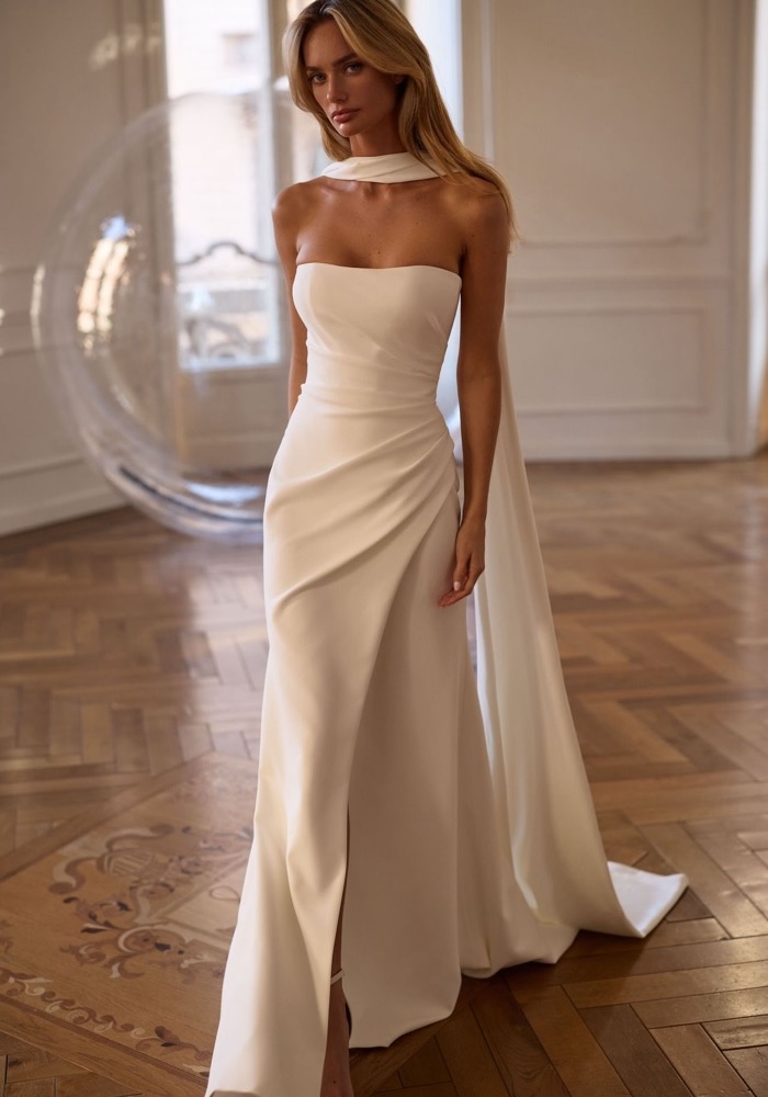 Strapless neckline mermaid wedding dress crafted from stretch crepe, featuring a beautifully draped bodice and skirt with a daring side slit.