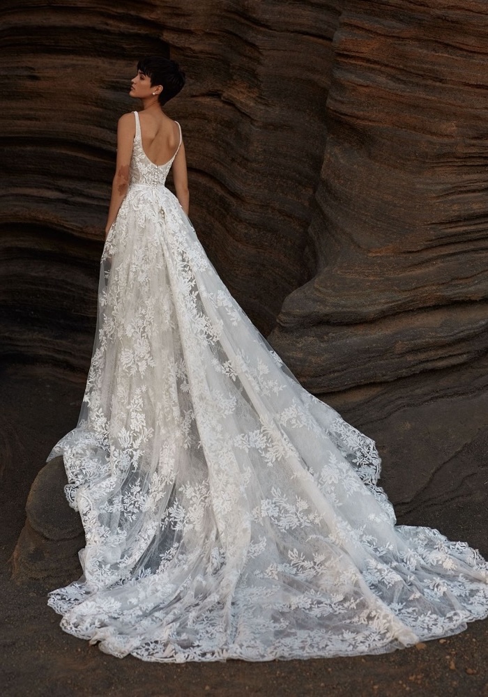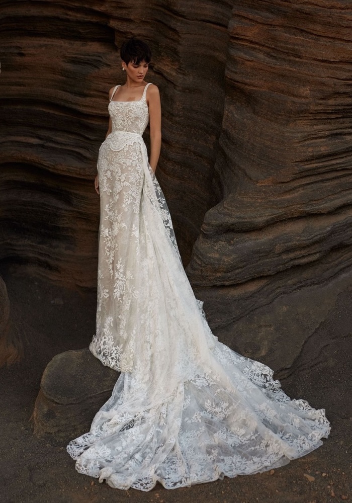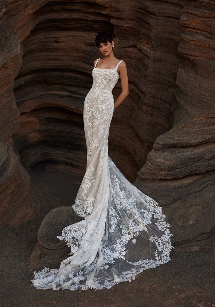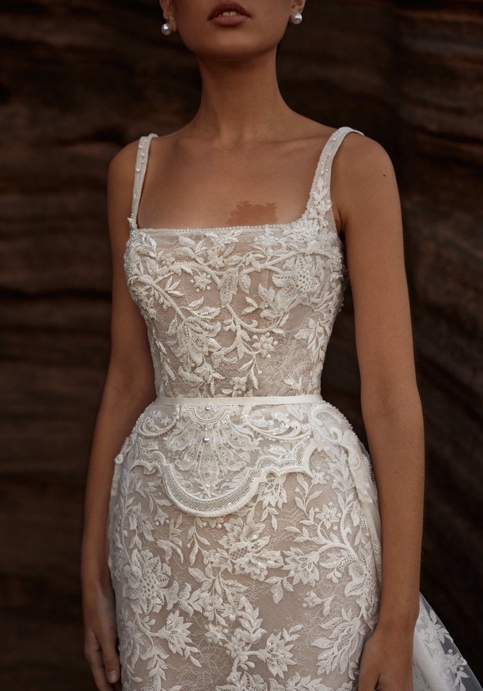 Square neck mermaid wedding dress crafted from glittery lace adorned with cascades of intricate floral appliques with a low back. The look van be elevated with a detachable train with matching floral appliques.