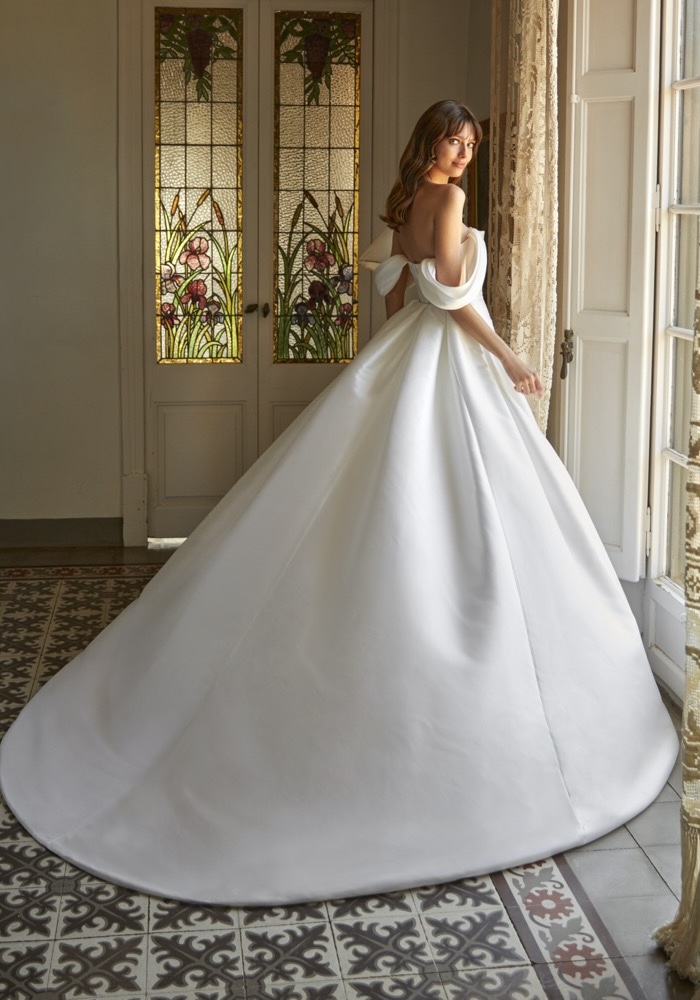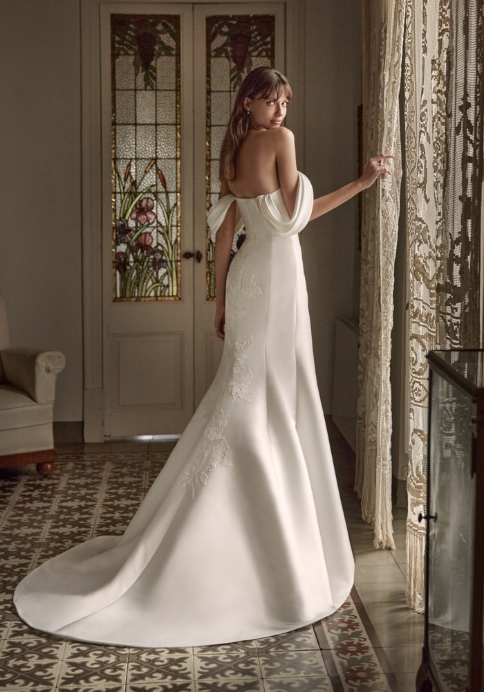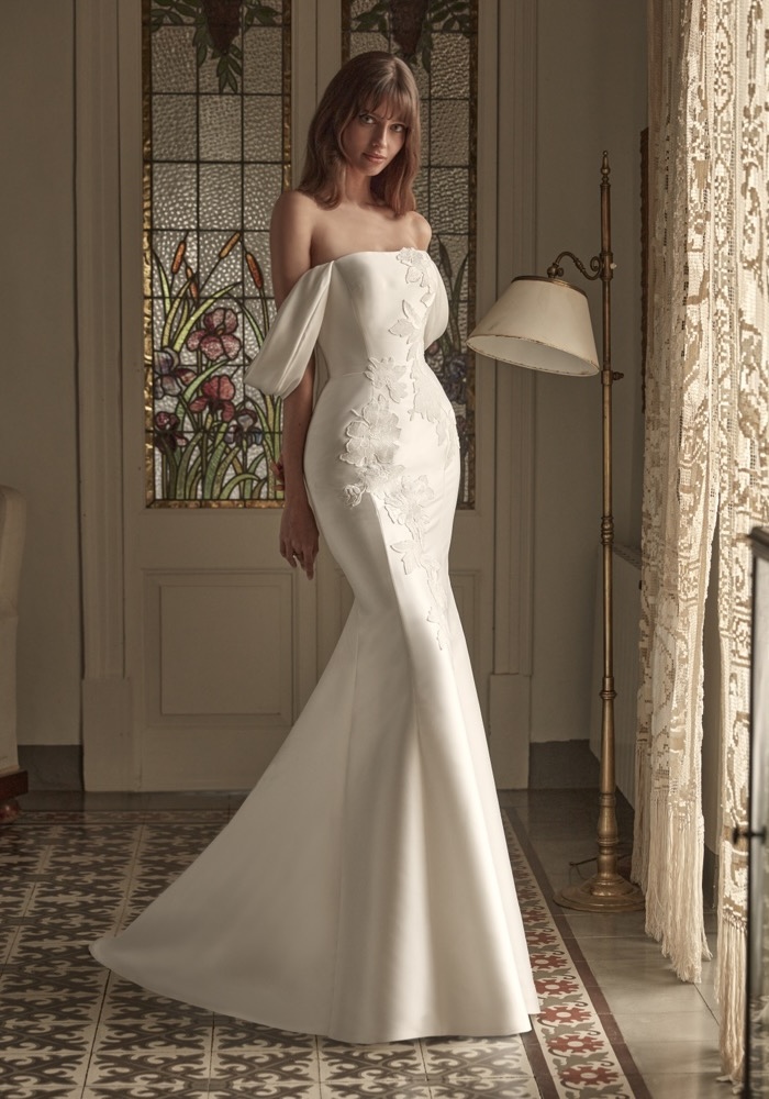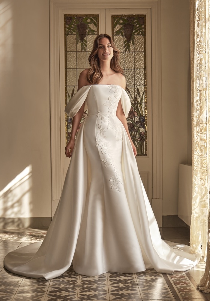 Off-shoulder mermaid wedding dress crafted from soft mikado adorned with lace motifs. Wear it with a detachable overskirt to personalise your bridal look.