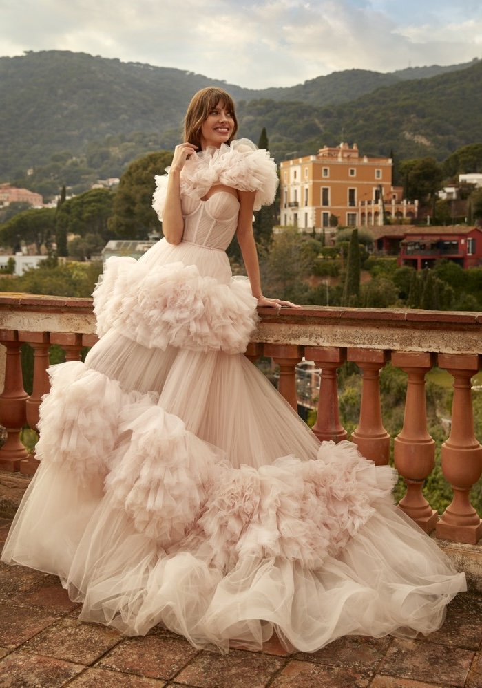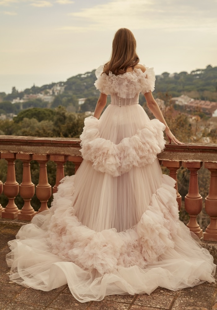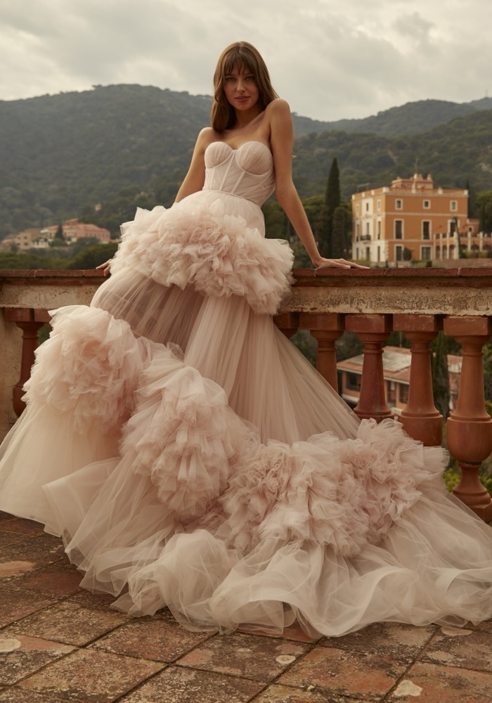 Sweetheart neckline princess wedding dress made of soft tulle with a structured bodice, featuring cascades of tiered ruffles on the skirt with a detachable jacket.