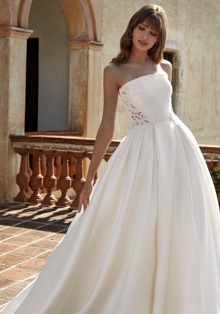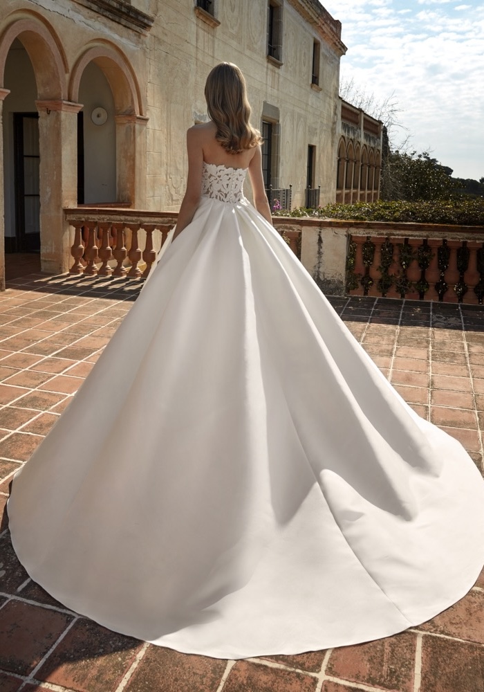 Strapless neckline princess wedding dress crafted from mikado, featuring illusion back adorned with beaded lace motifs and a long train.