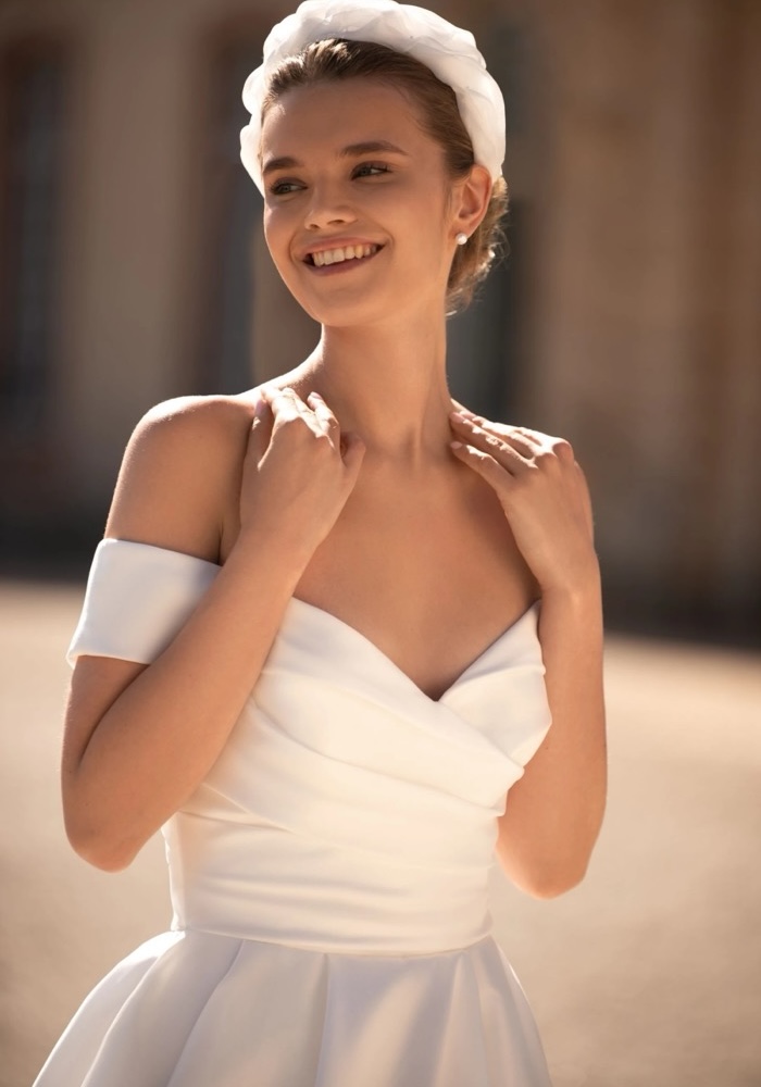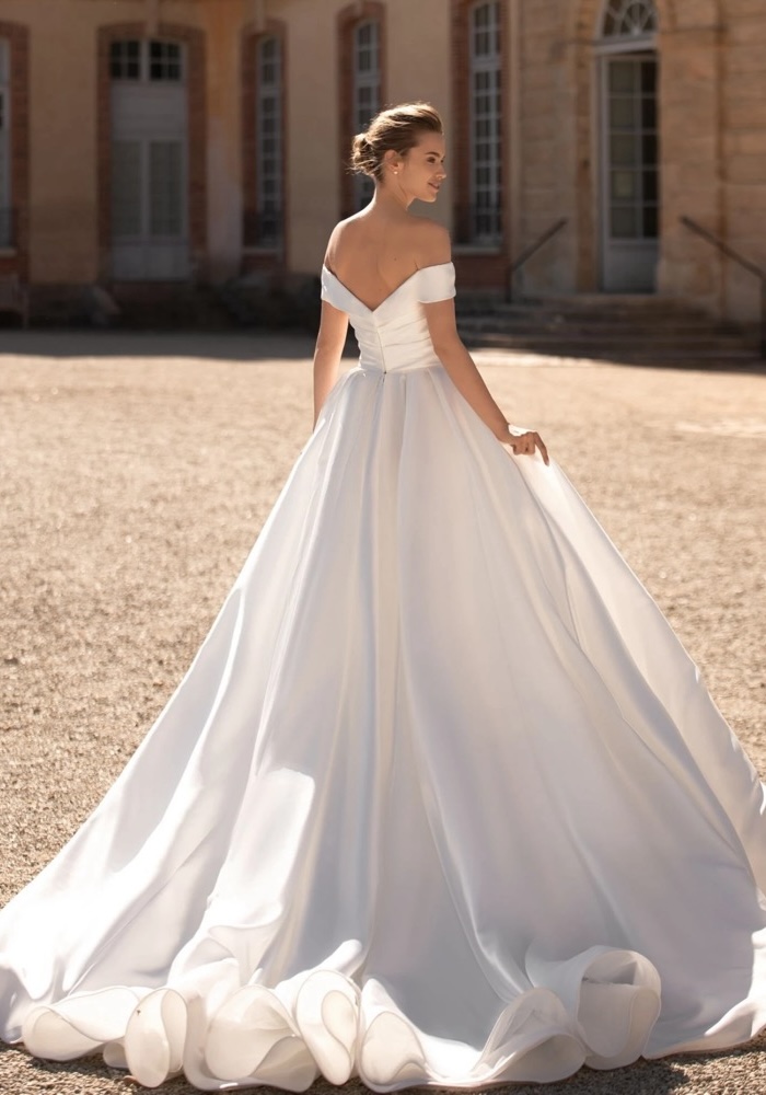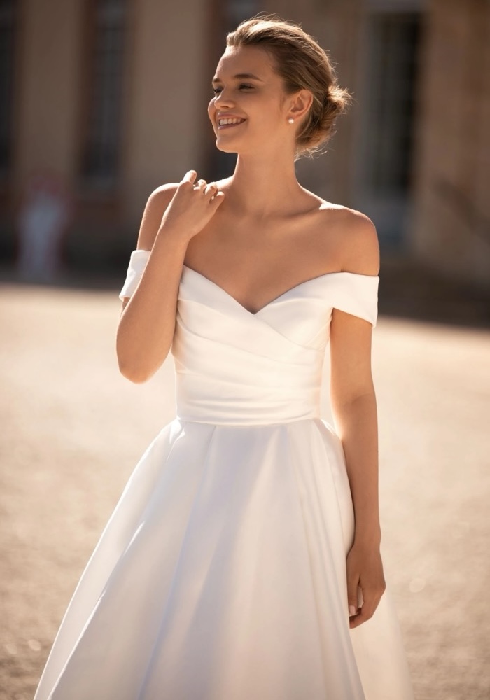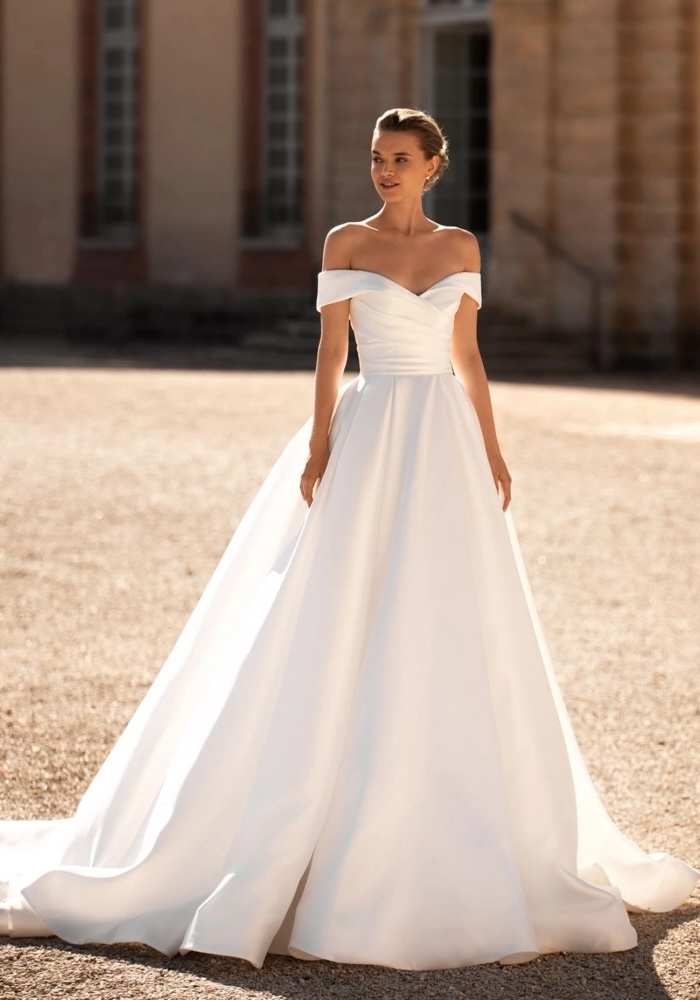 Off-shoulder A-line wedding dress made of mikado fabric with a beautifully pleated bodice, featuring practical side pockets on the skirt with a long train.
