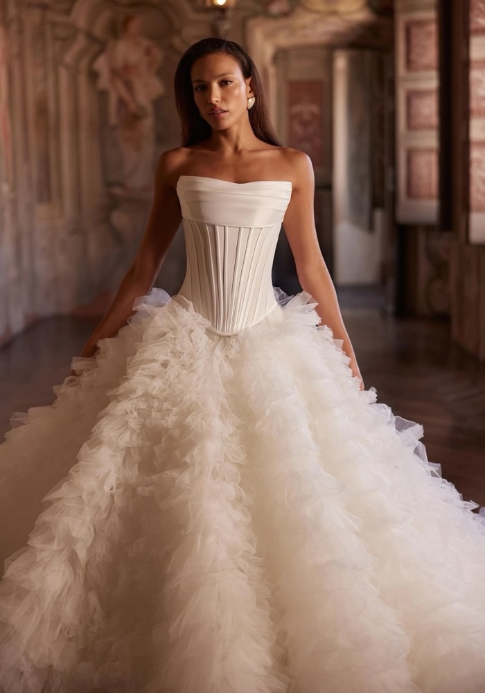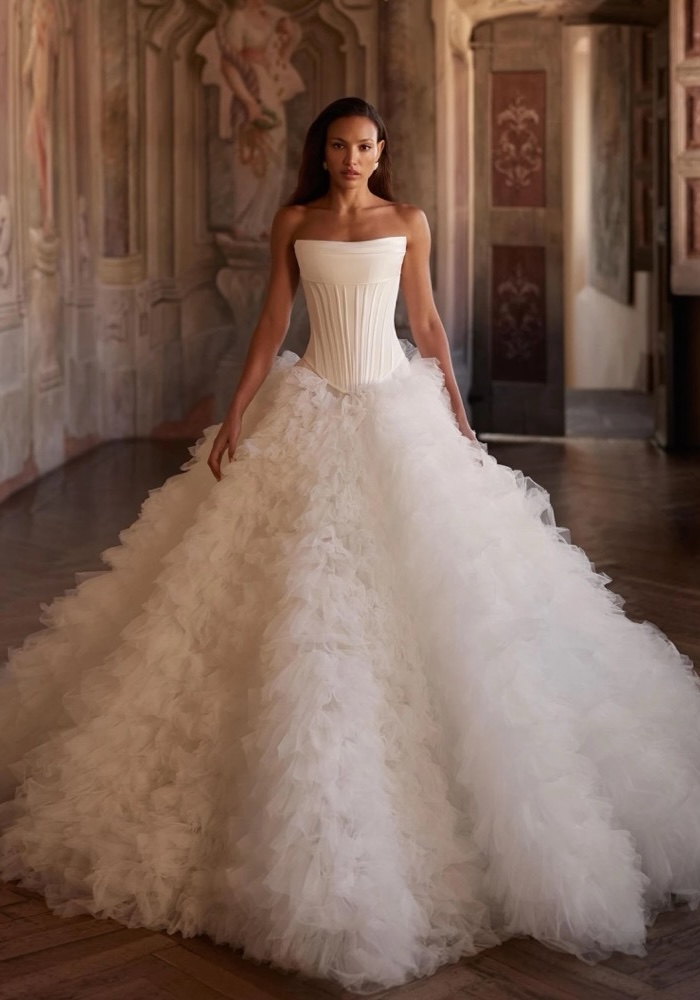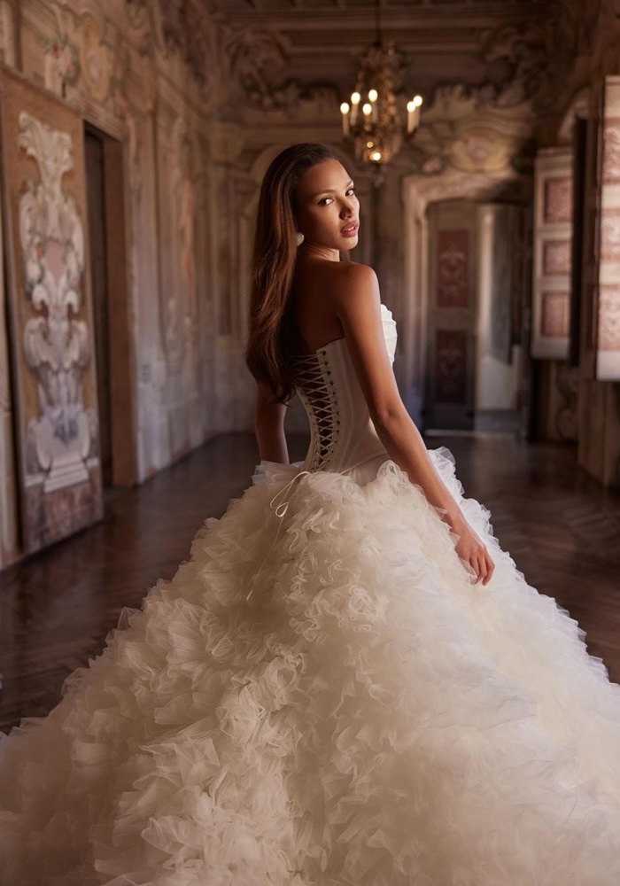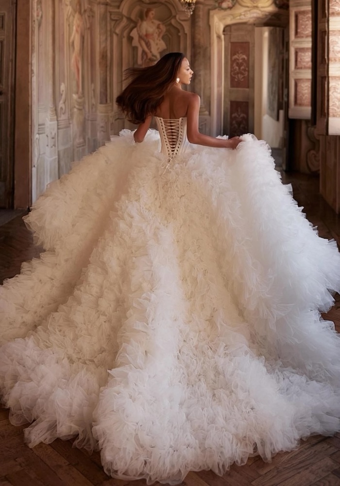 This strapless princess wedding dress features a sculpted corset bodice adorned with horizontal drapery at the neckline and a lace-up back. The voluminous tulle skirt, composed of delicate frills, flows into a dreamy long train.
