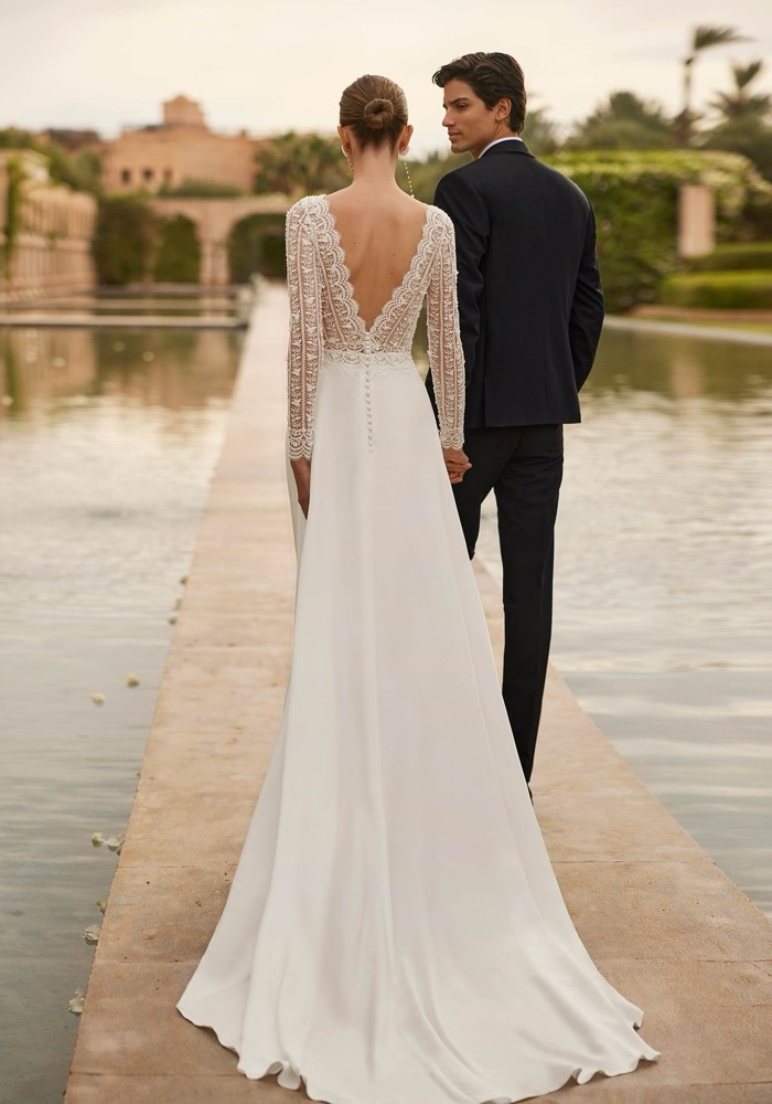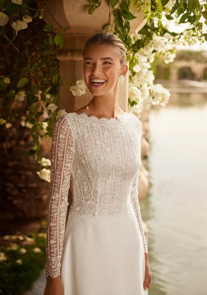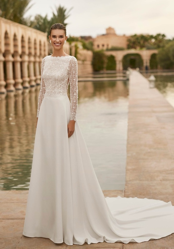 Bateau neckline A-line wedding dress with a beautiful beaded floral lace bodice and sleeves with a low back. Flowing skirt made of stretch crepe with a long train.