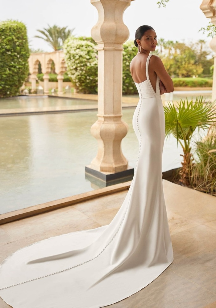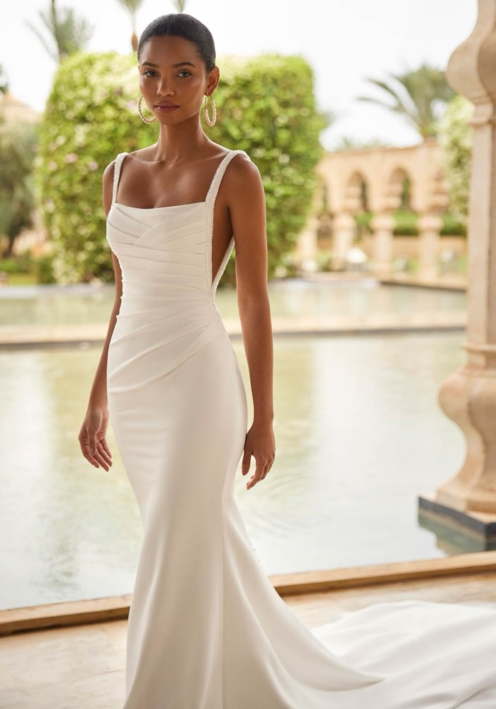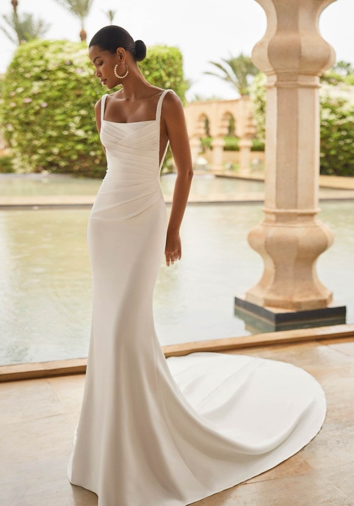 Square neck mermaid wedding dress crafted from stretch crepe, featuring a beautifully draped bodice, elegantly finished with beaded straps.