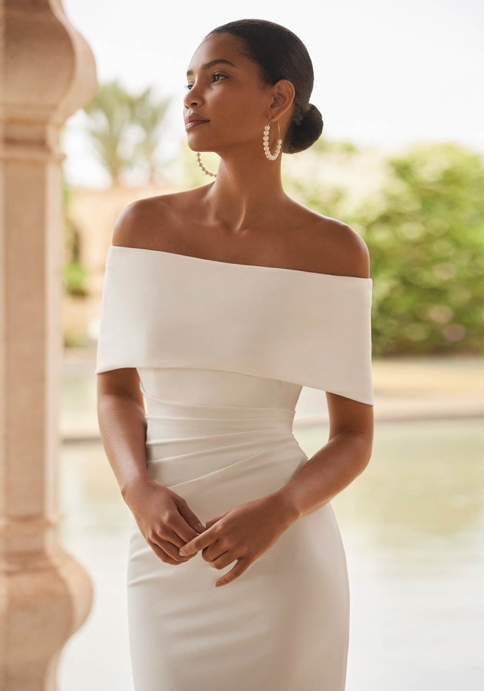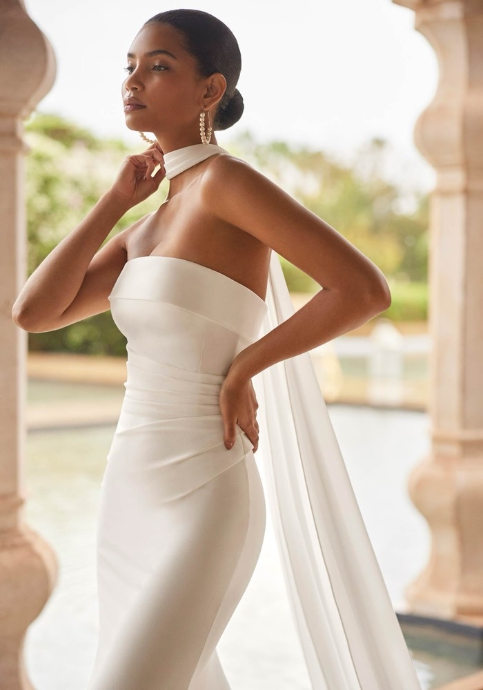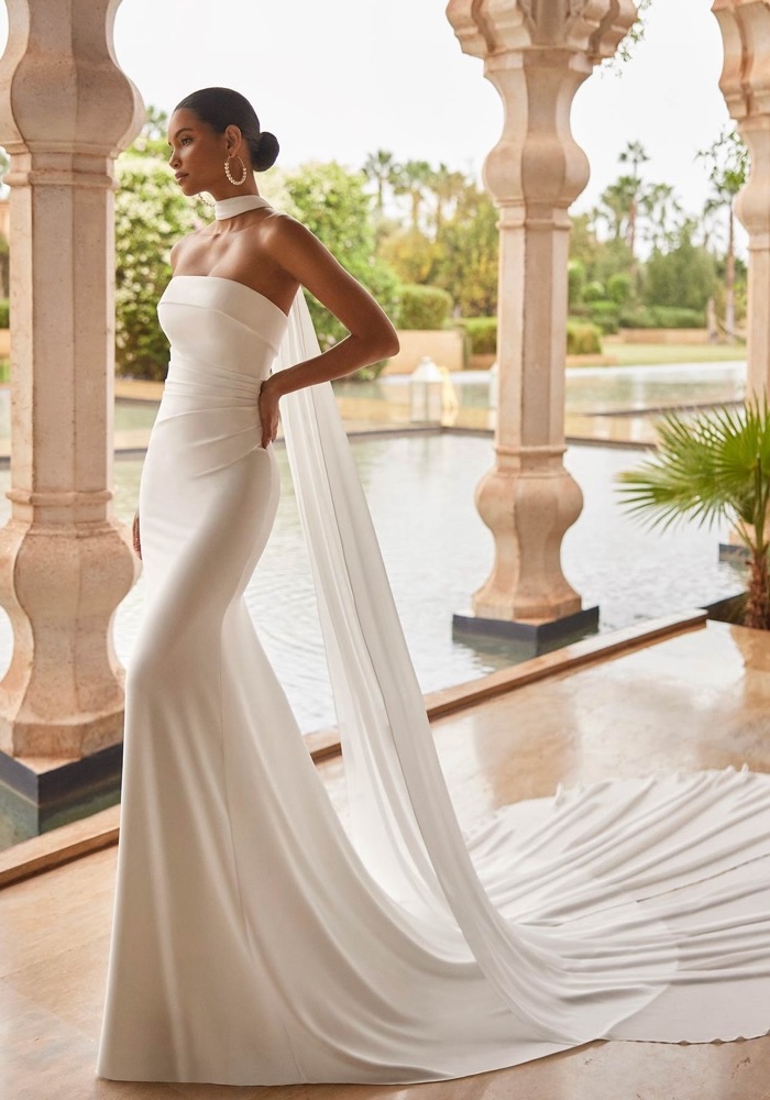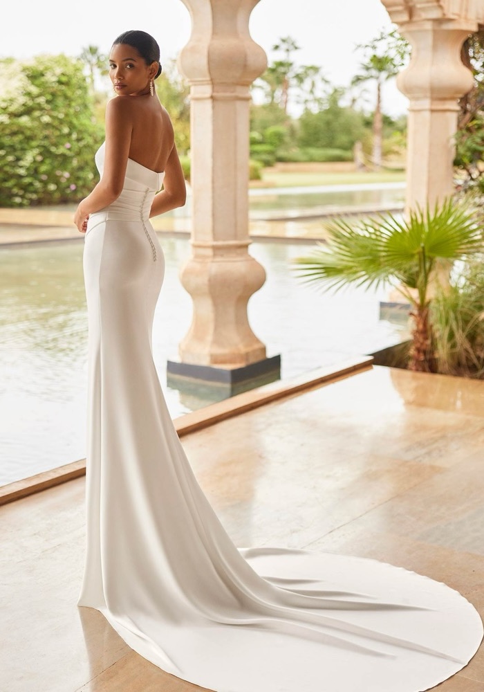 Strapless neckline wedding dress crafted from stretch crepe, featuring a beautifully draped waist with a long train.