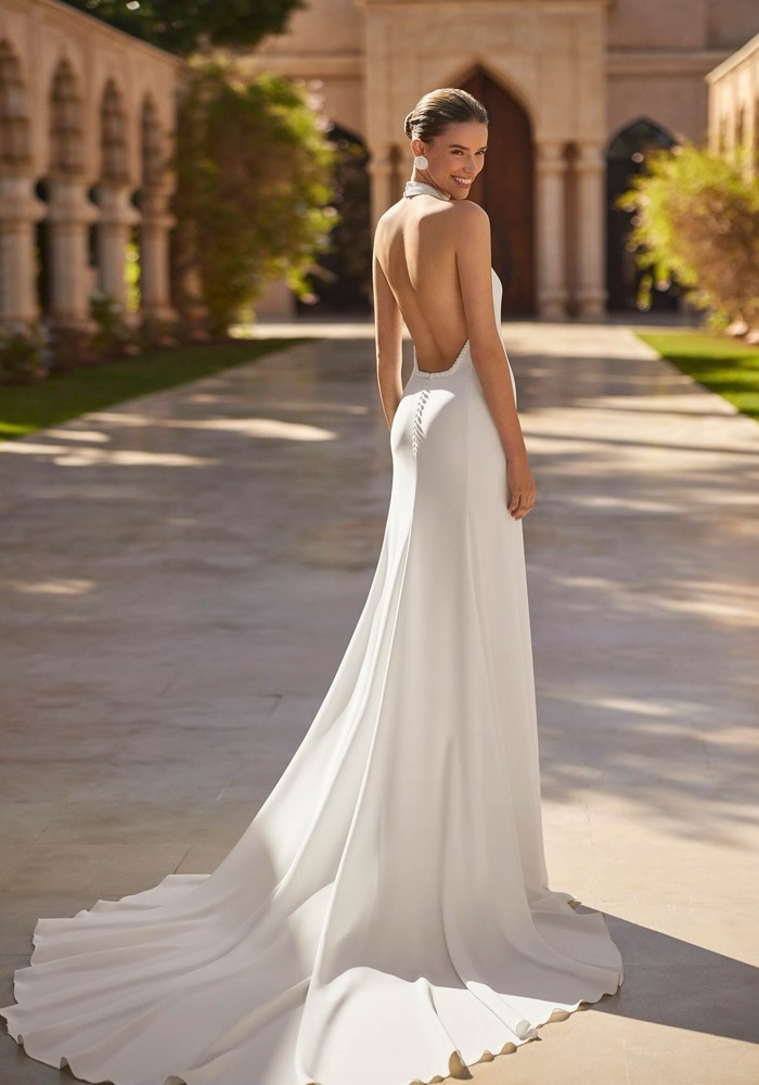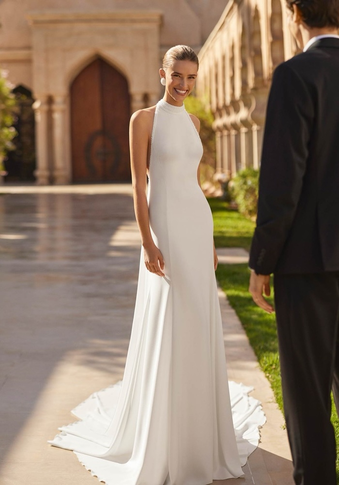 Halter neckline mermaid wedding dress crafted from stretch crepe adorned with intricate beadwork along the neckline and back.