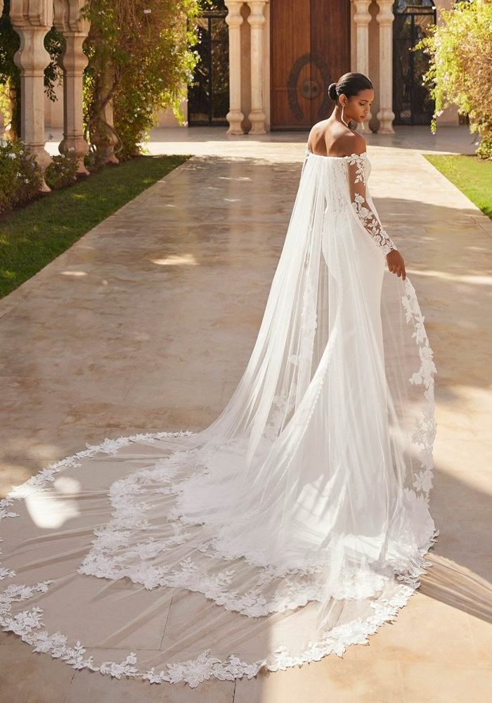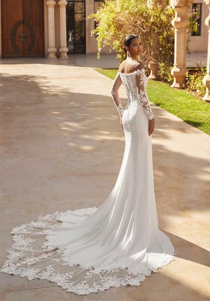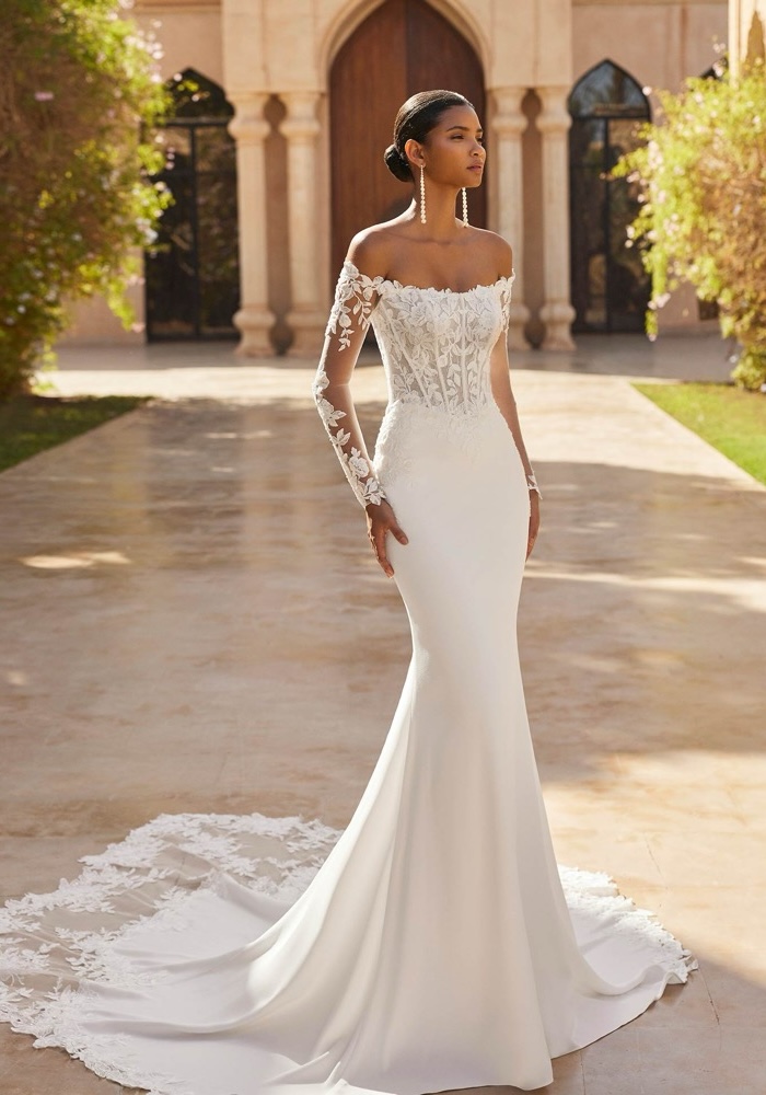 Off-shoulder mermaid wedding dress with a sculpted, floral lace bodice decorated with shimmering beadwork, and featuring tattoo-effect sleeves. Fitted skirt made of stretch crepe with an embroidered illusion train.