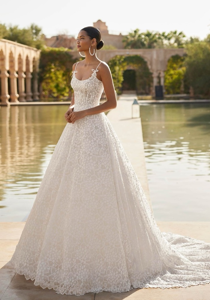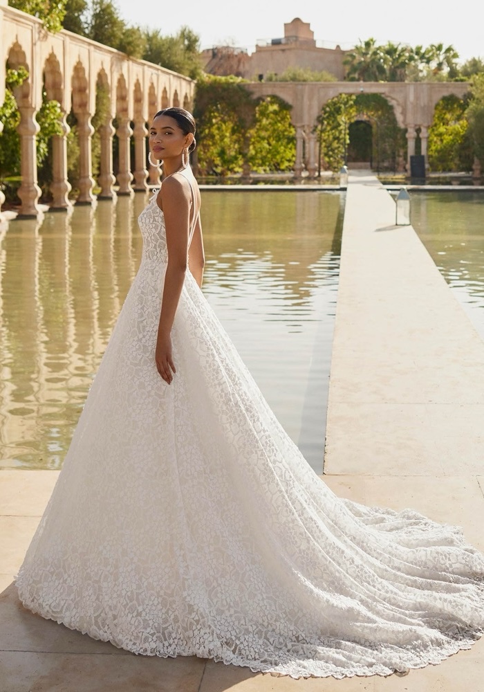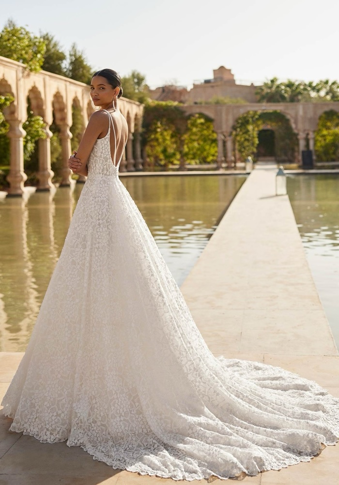 Scoop neck princess wedding dress made of delicate floral lace, featuring beaded straps and a low back.