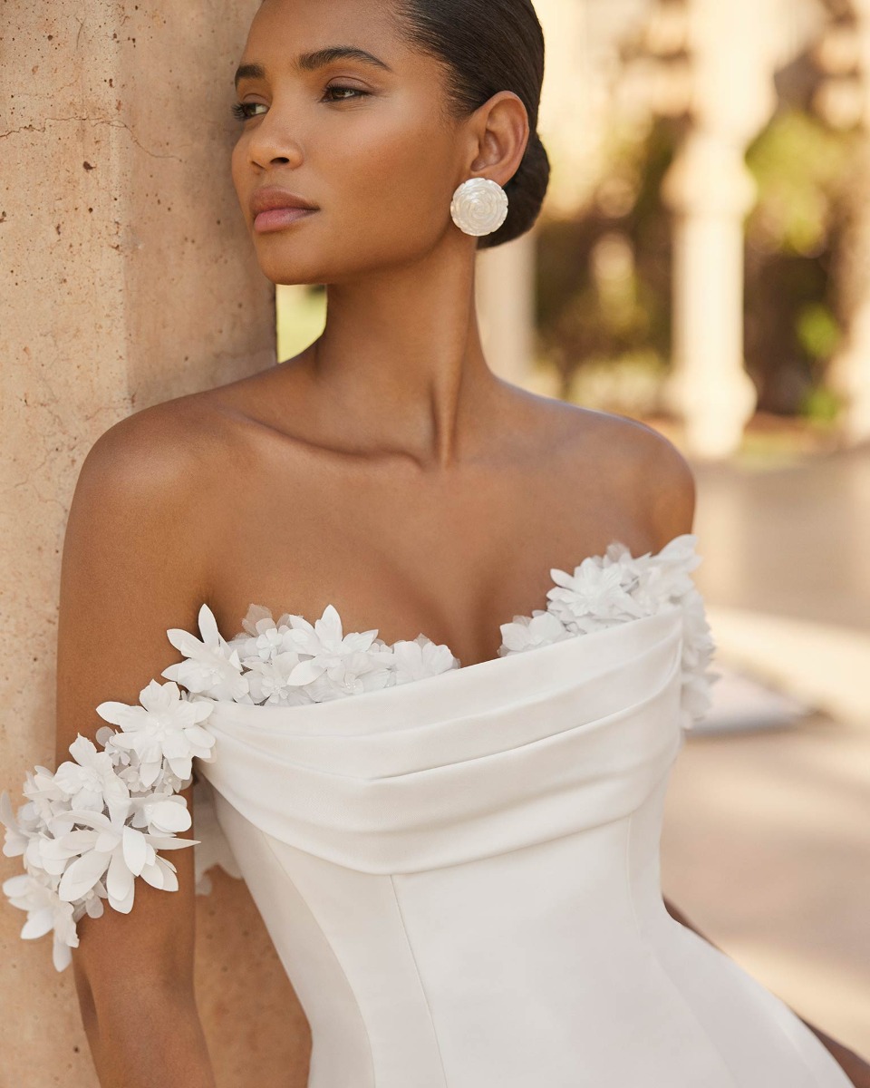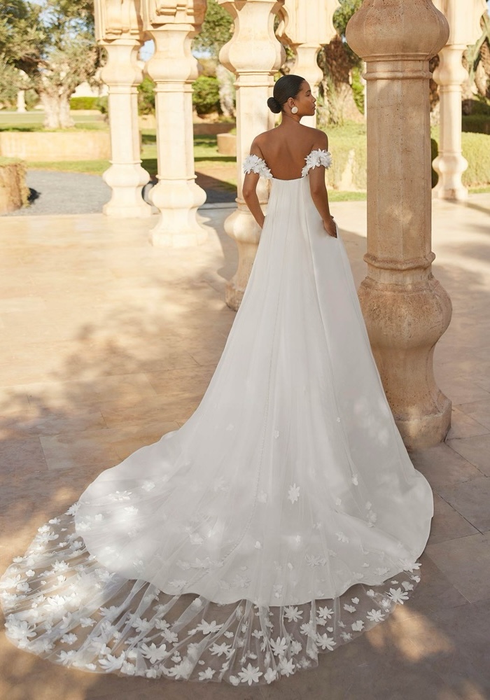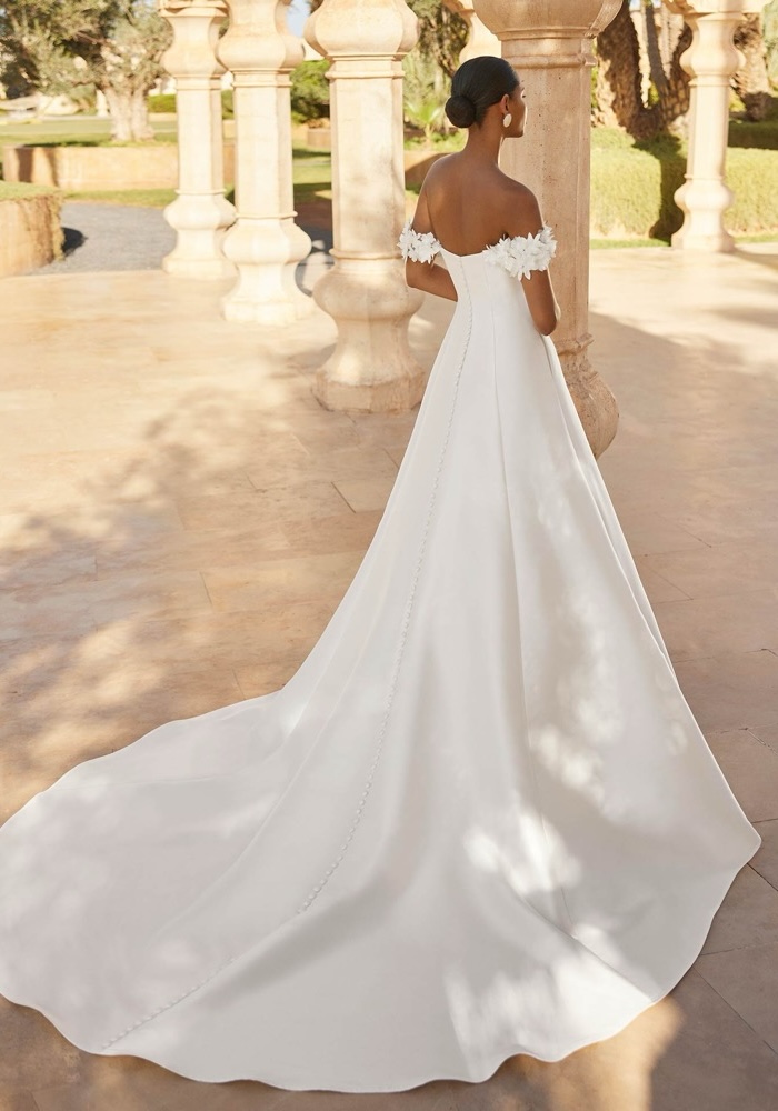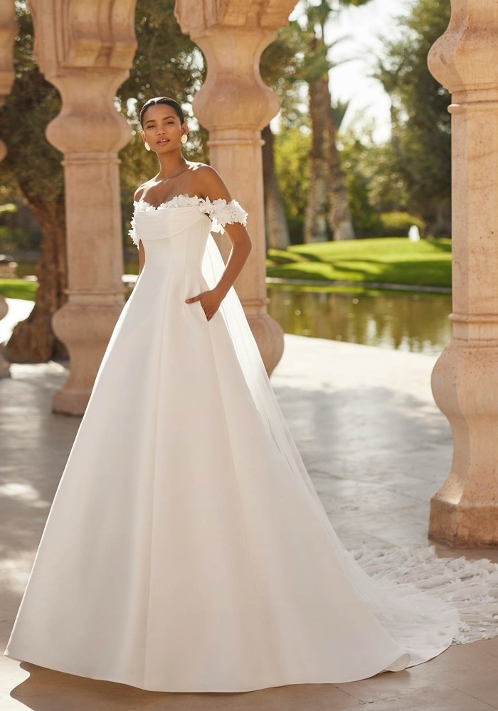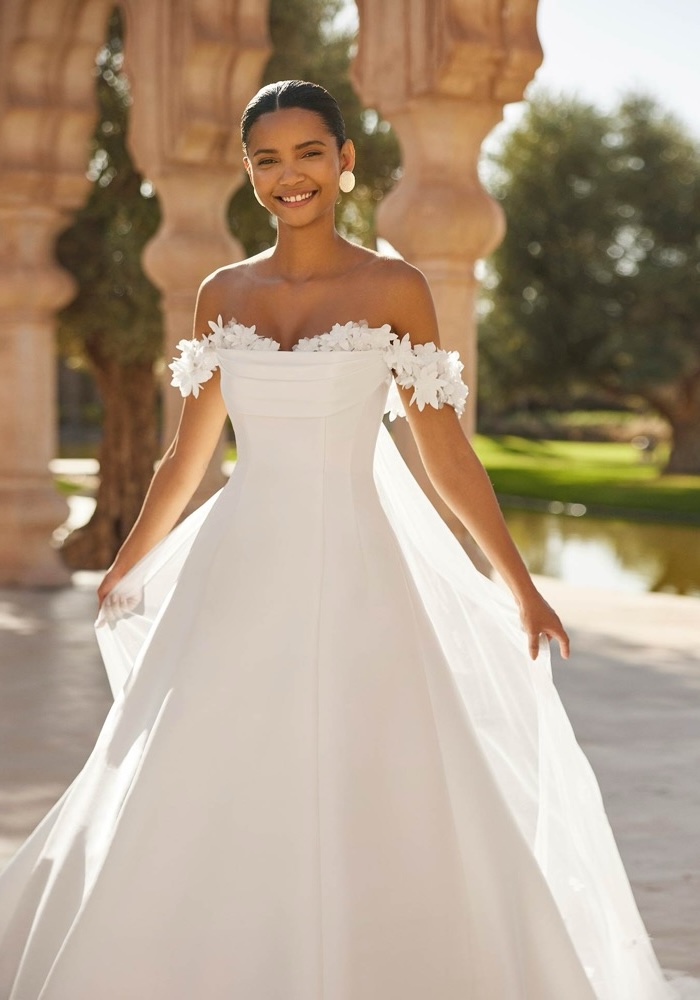Off-shoulder A-line wedding dress crafted from mikado with intricate 3D flowers along the neckline and straps Pair it with a detachable tulle train with 3D flowers to personalise your look.