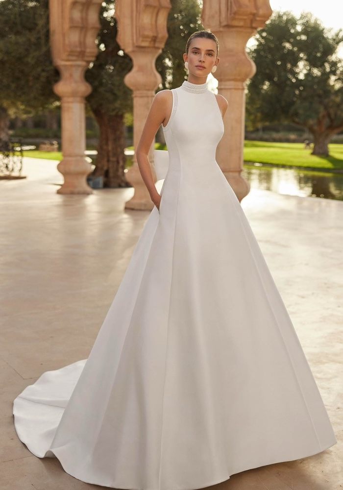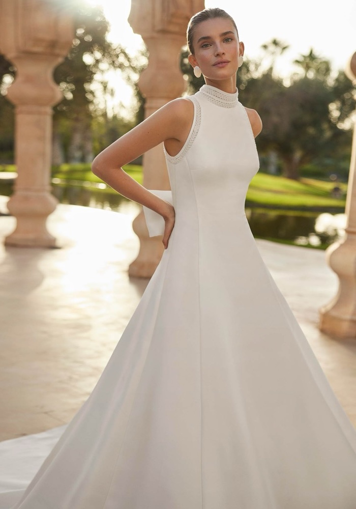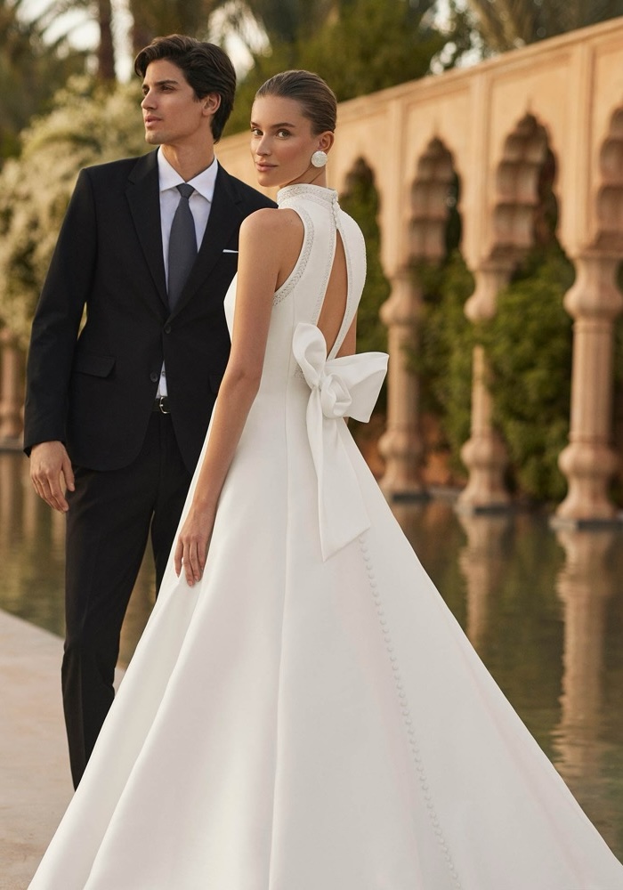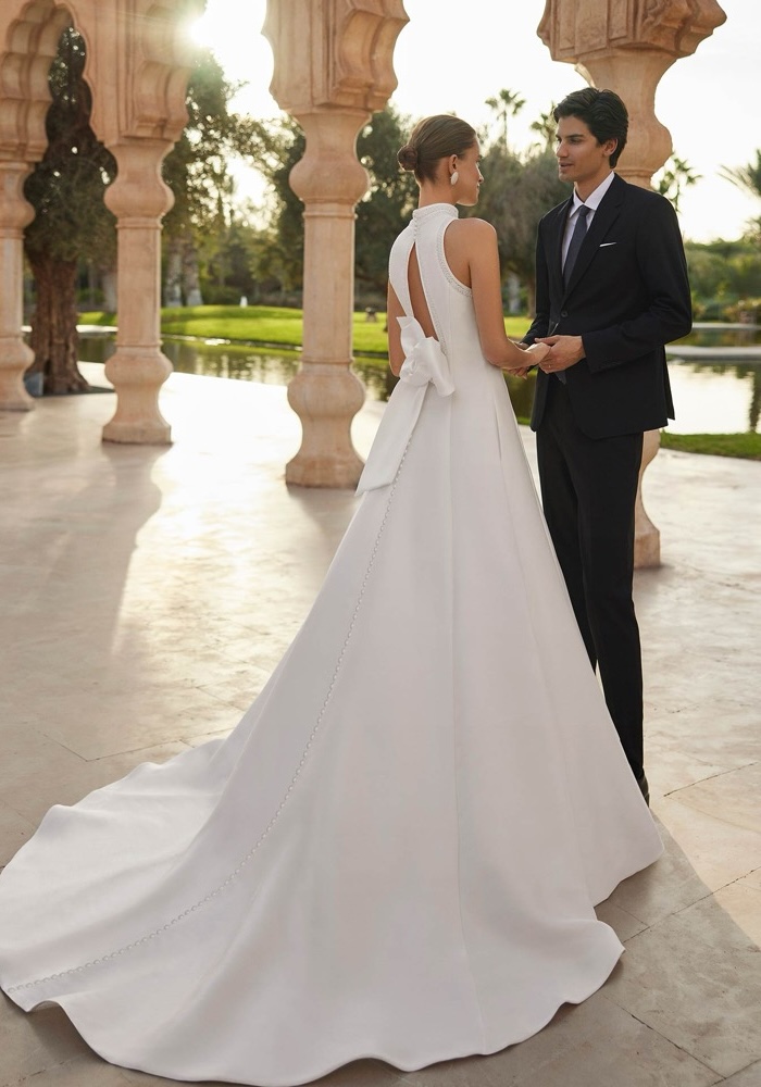 Halter neckline A-line wedding dress made of mikado decorated with beaded trim along the neckline and shoulders, featuring a daring keyhole back with a bow.