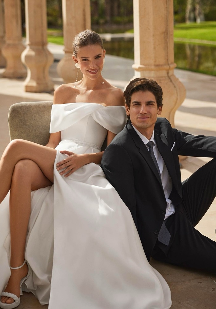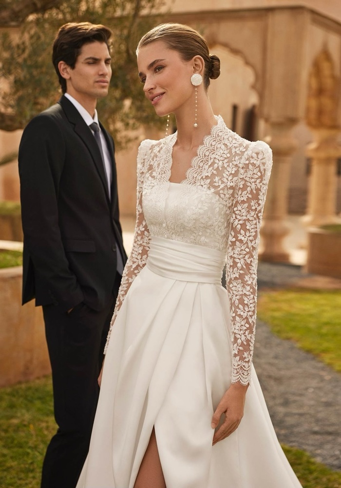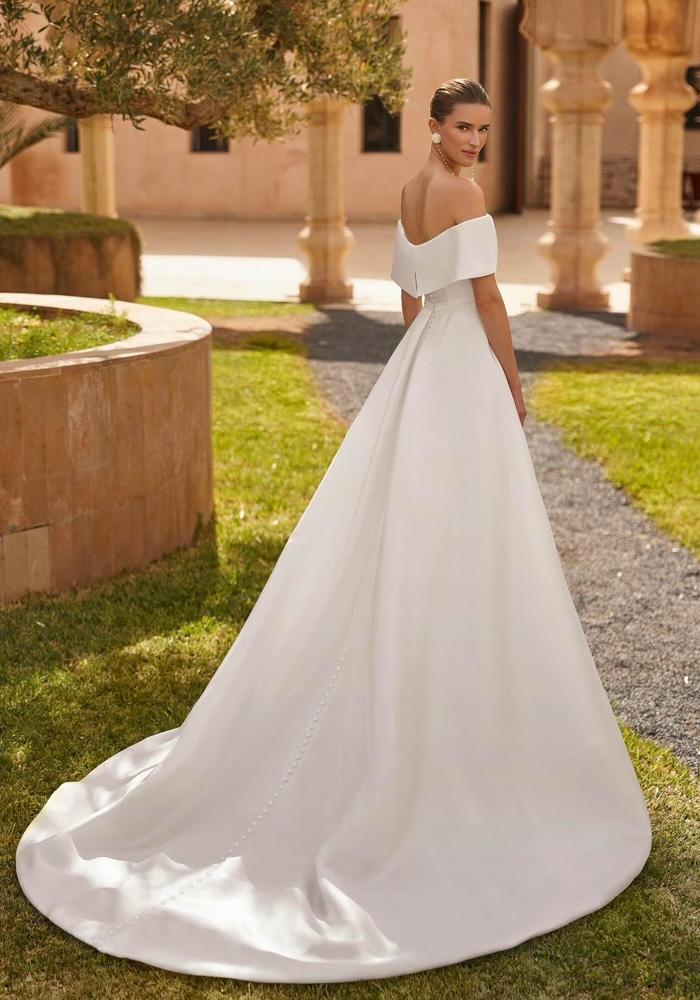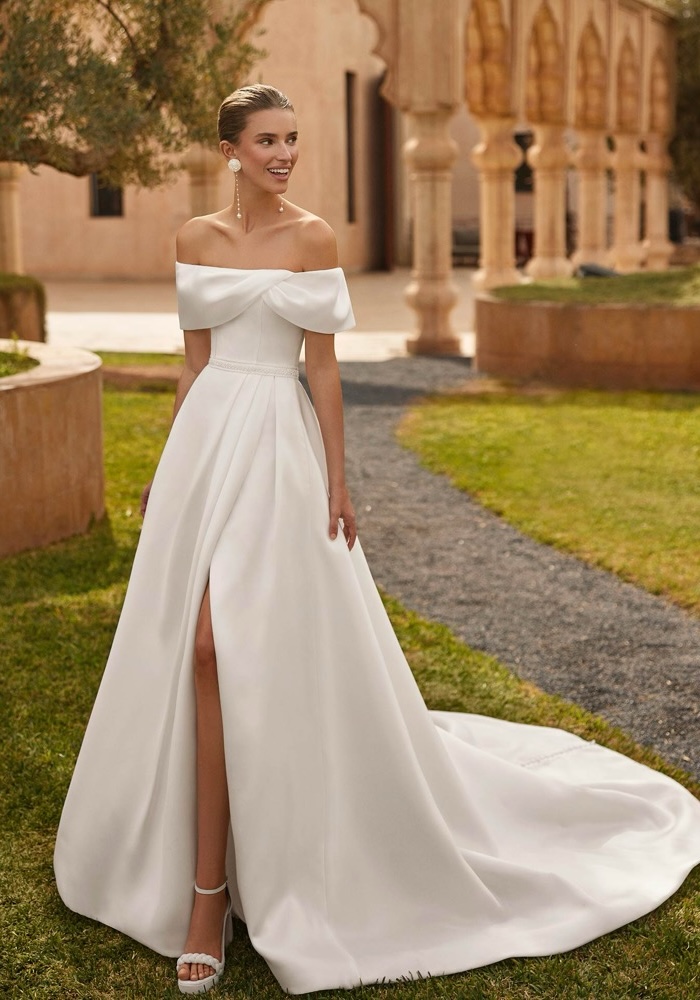 Strapless neckline A-line wedding dress crafted from mikado with a hidden slit. Wear it with a removable off-shoulder jacket to personalise your look.
