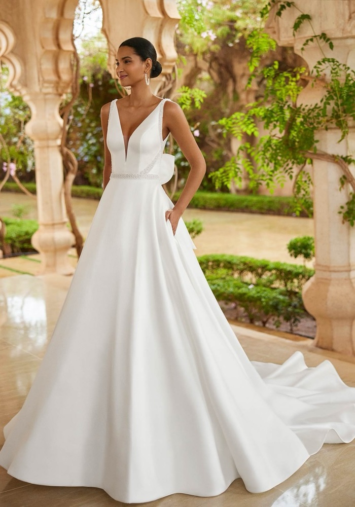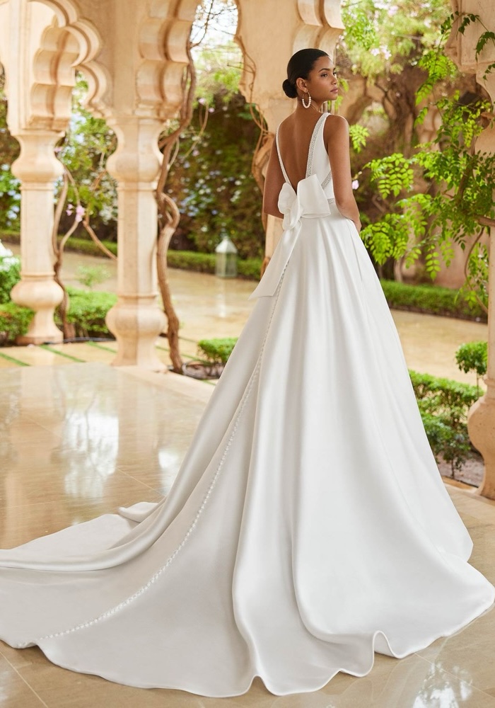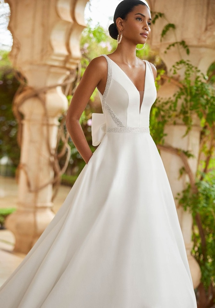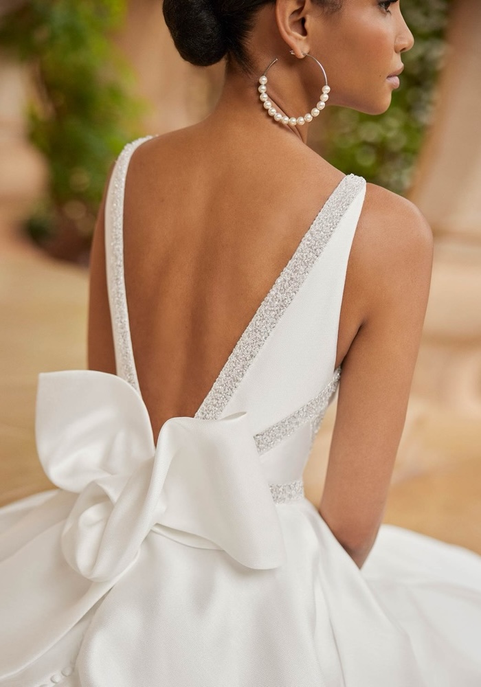 Plunging neckline A-line wedding crafted from mikado adorned with intricate beading on the bodice, featuring a statement back bow with a long train.