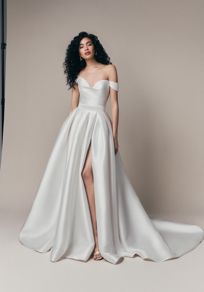 Sweetheart neckline short wedding dress crafted from mikado with a beautiful pleated bodice and skirt. Pair it with a long removable overskirt to personalise your bridal look.