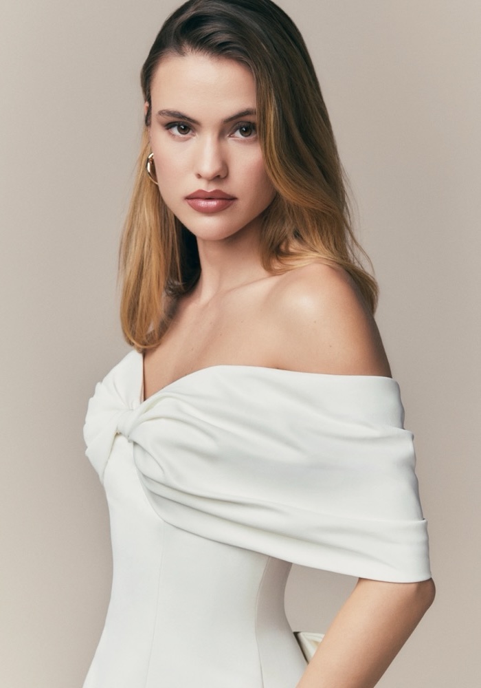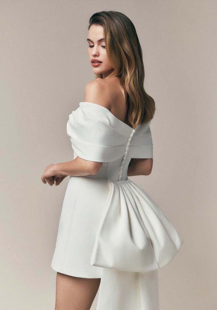 Off-shoulder short wedding dress crafted from stretch satin with a beautifully draped neckline, featuring a draped back bow that flows down into two elegant straps.
