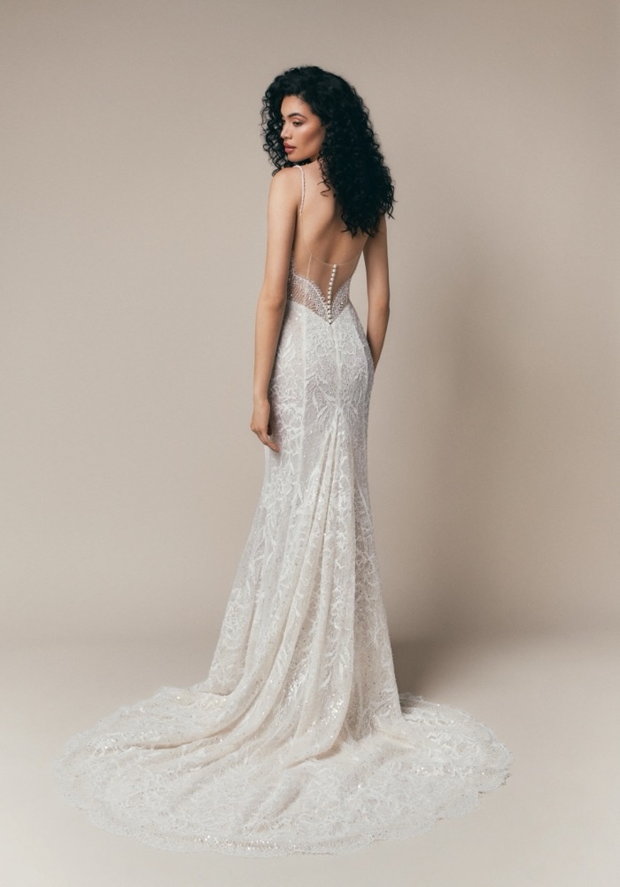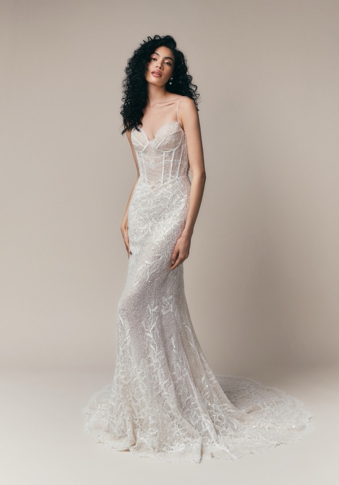 Sweetheart neckline mermaid wedding dress with a sculpted, corset bodice, featuring cascades of intricate beaded lace detail throughout the entire gown with a low back.