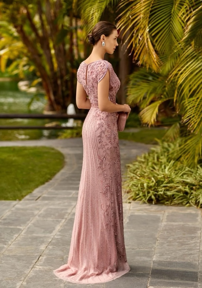 Boat neck mermaid evening gown made of embroidered tulle, adorned with intricate floral embellishments and beading all over.