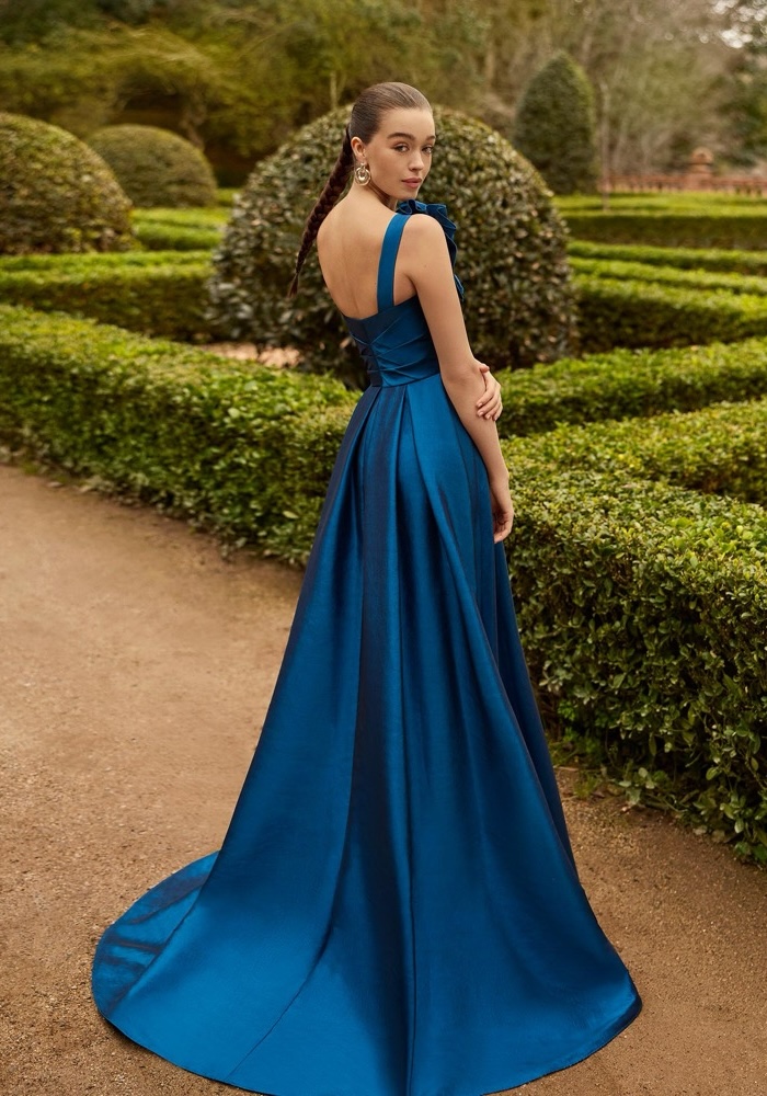 One-shoulder A-line taffeta evening gown with a pleated bodice, draped rose detail on the shoulder, and a hidden skirt slit.