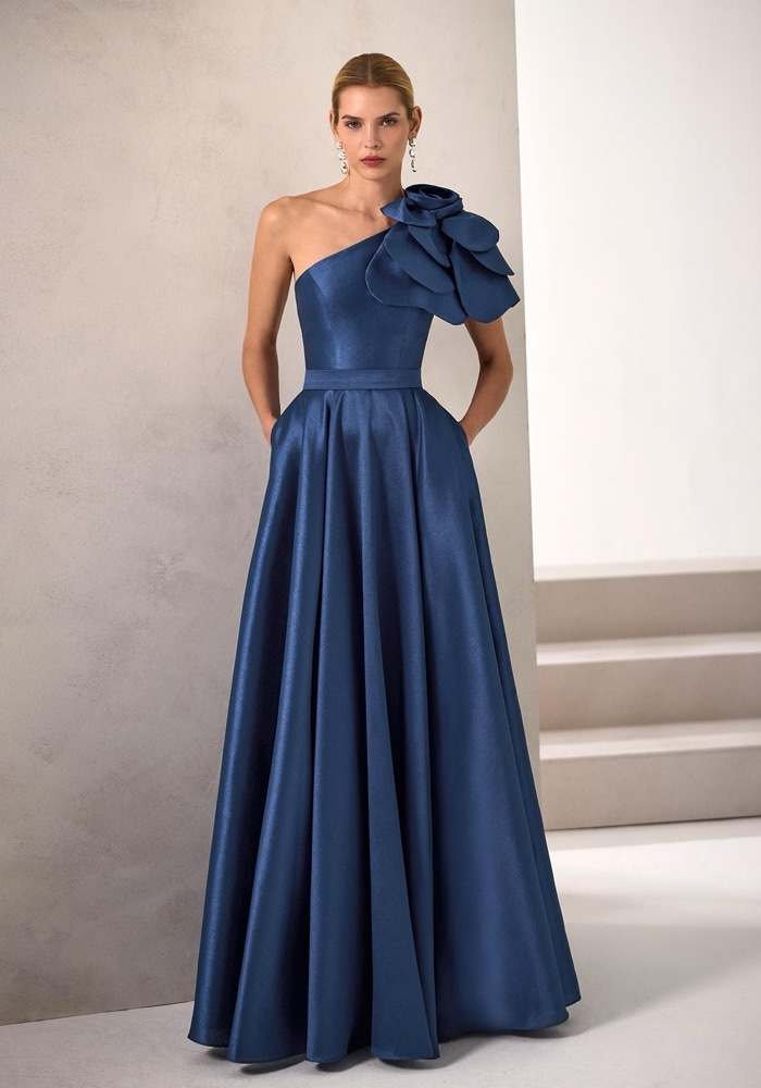 One-shoulder A-line evening gown made of taffeta with floral details at the shoulder with hidden pockets on the skirt.
