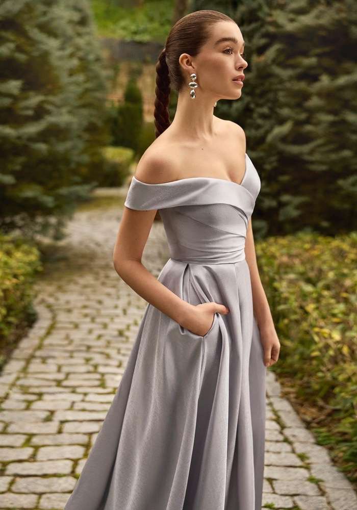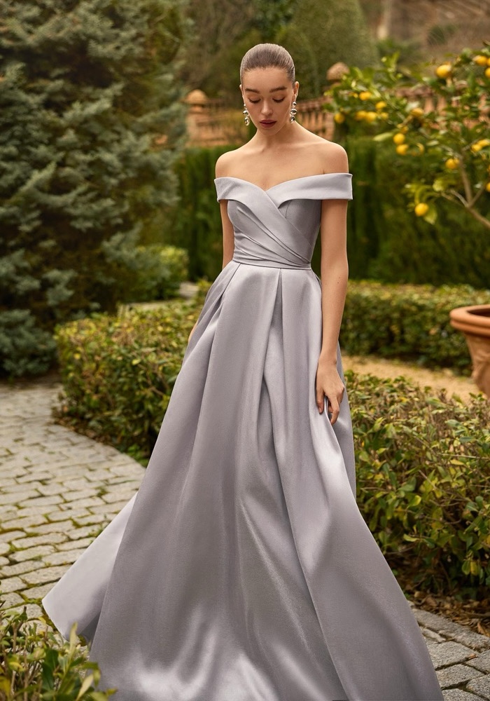Off-shoulder A-line evening gown made of mikado with a pleated bodice, featuring practical hidden pockets.
