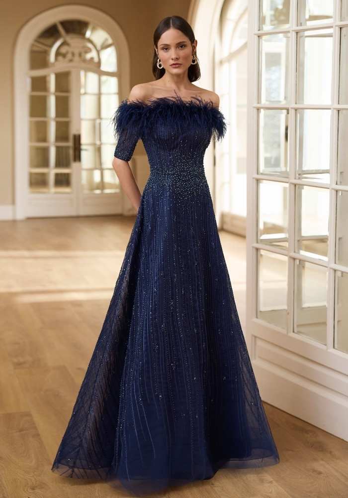 Designed for unforgettable moments, this gown combines timeless elegance with captivating detail. The flattering off-shoulder neckline and A-line shape create a sleek, sophisticated silhouette. Each step reveals the mesmerizing shimmer of hand-beaded cascades, elevated by a soft flourish of feathers along the neckline for a truly show-stopping allure.