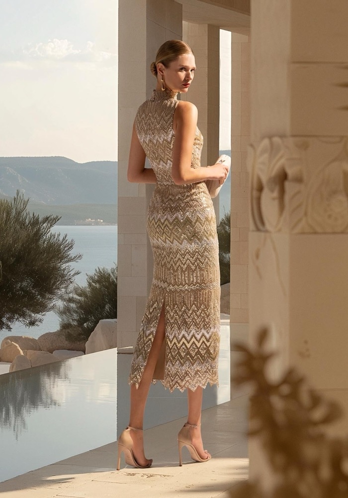 Halter neckline party dress fully embellished with metallic sequins all over.