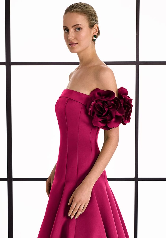 Off-shoulder A-line evening gown made of silky satin, featuring romantic rose sleeves.