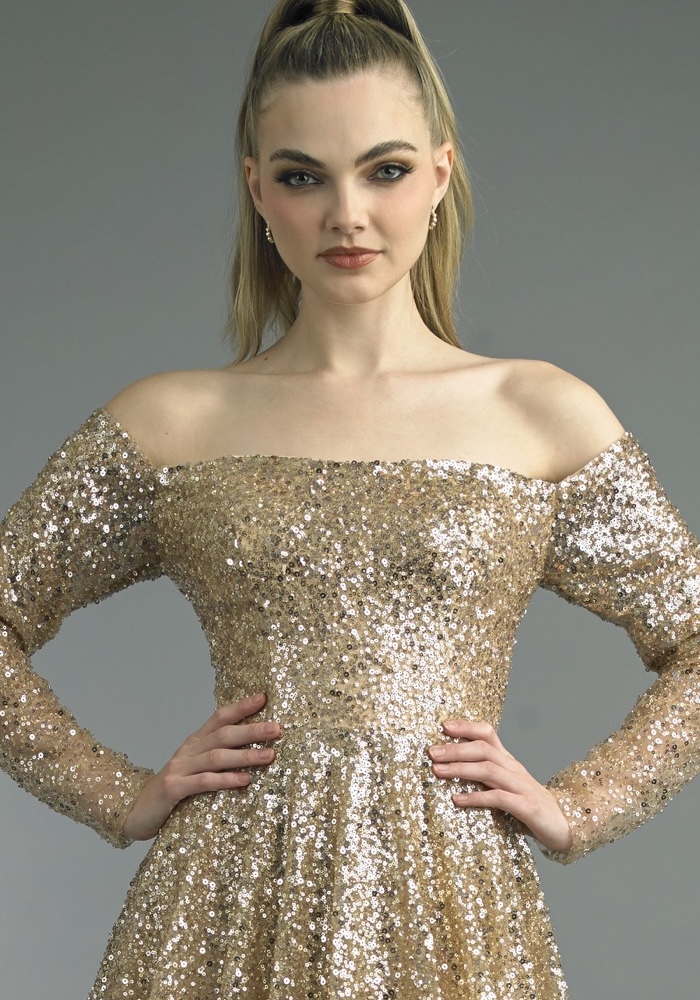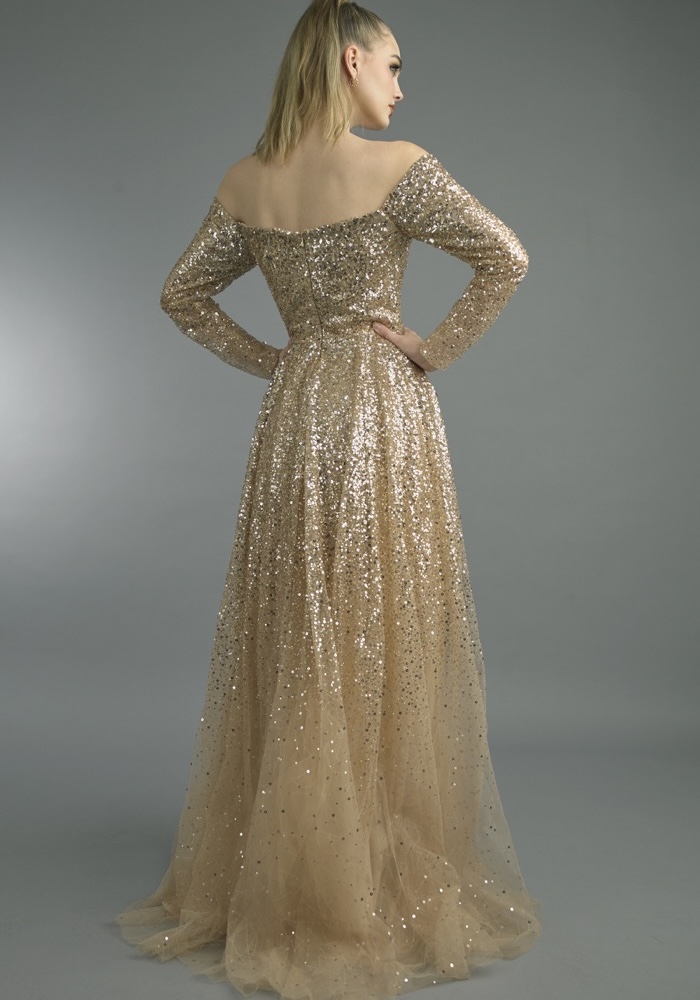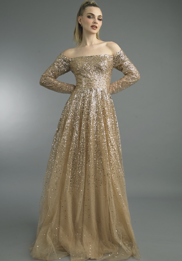 Off-shoulder A-line evening gown made of tulle adorned with shimmering sequins throughout the entire gown with long sleeves.