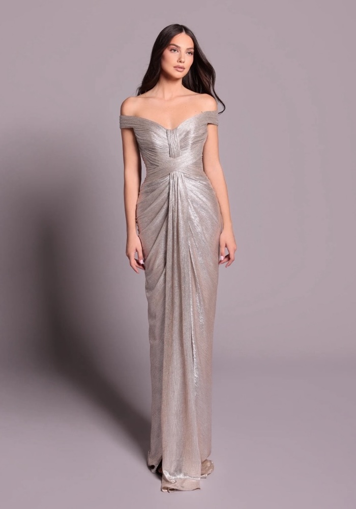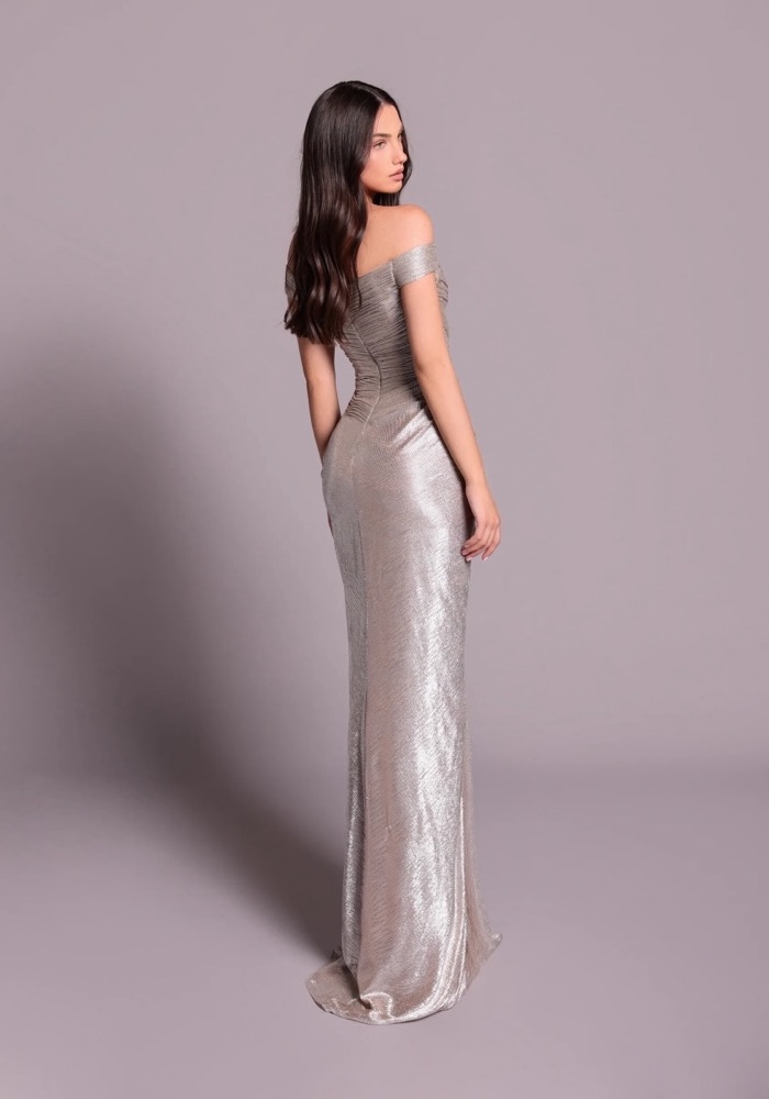 Off-shoulder mermaid evening gown with a beautifully ruched bodice and a draped skirt.