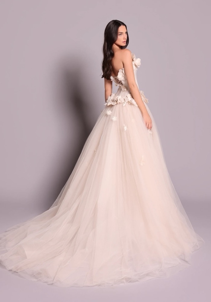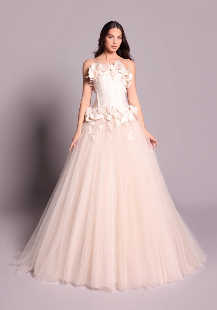 Strapless neckline evening gown with a tailored satin bodice, adorned with intricate 3D flowers. Voluminous skirt crafted from layers of soft tulle, perfect for any party and celebration.